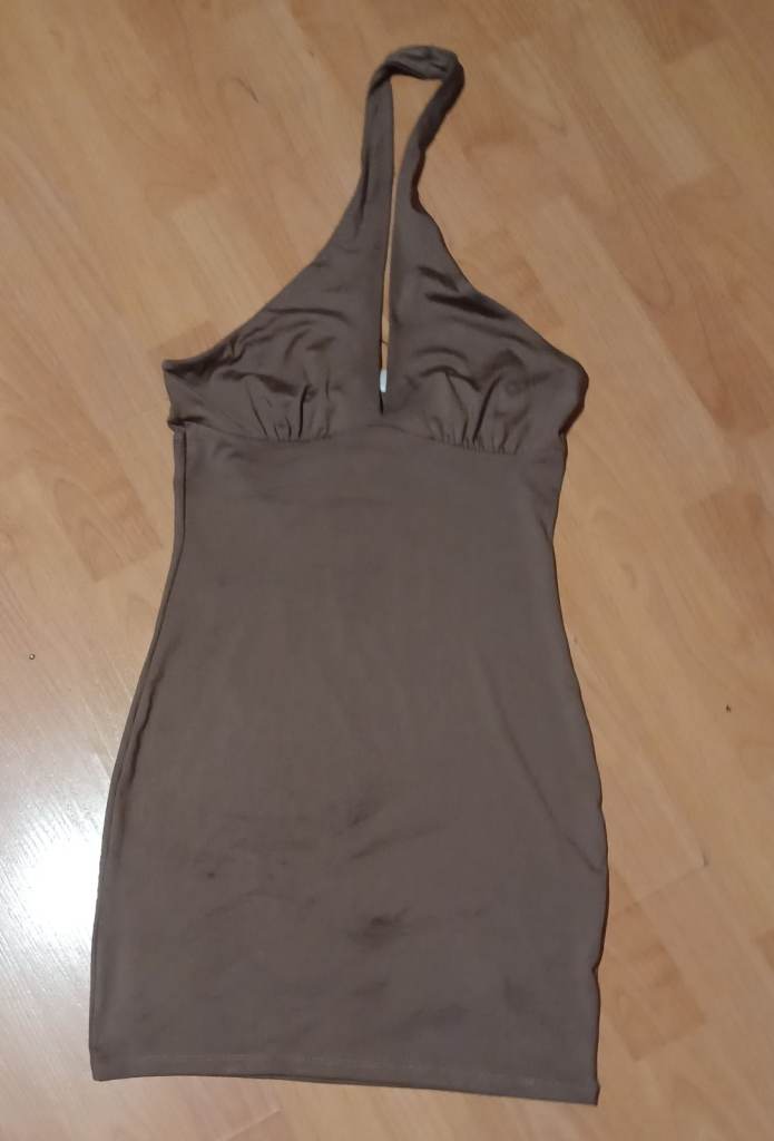 Stylish brown mini dress with a halter neck design, perfect for a night out or casual wear.