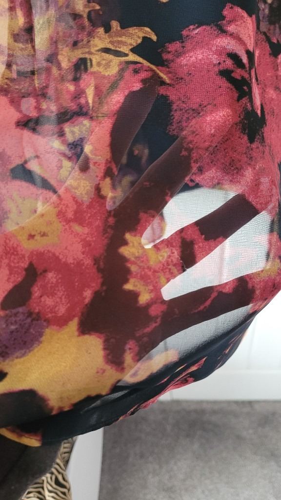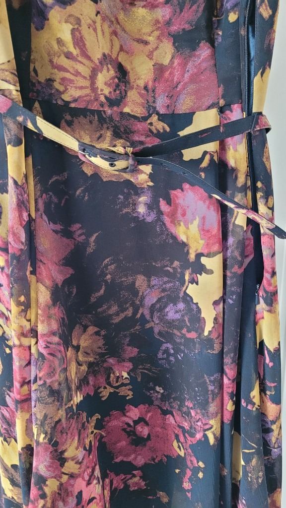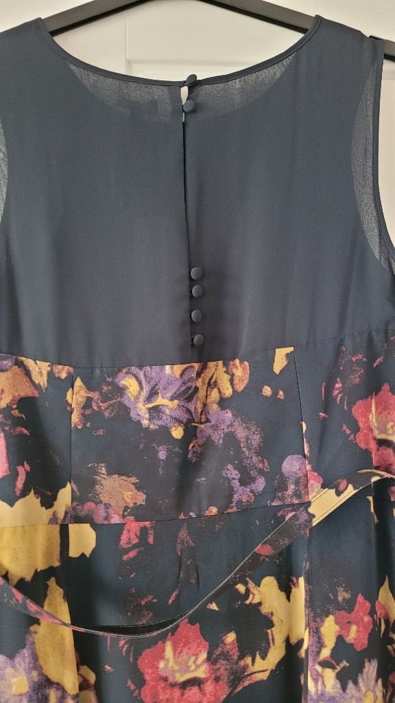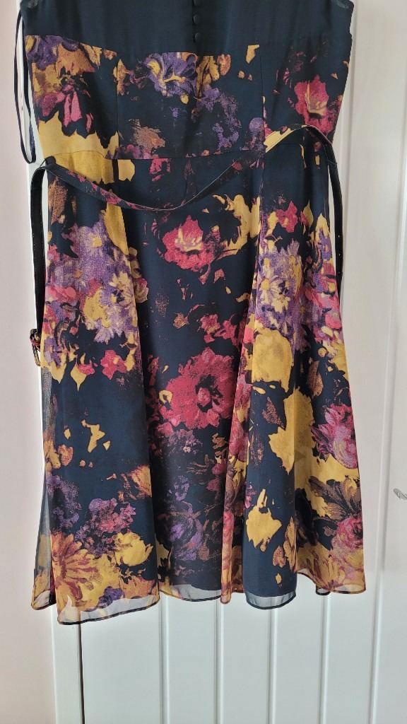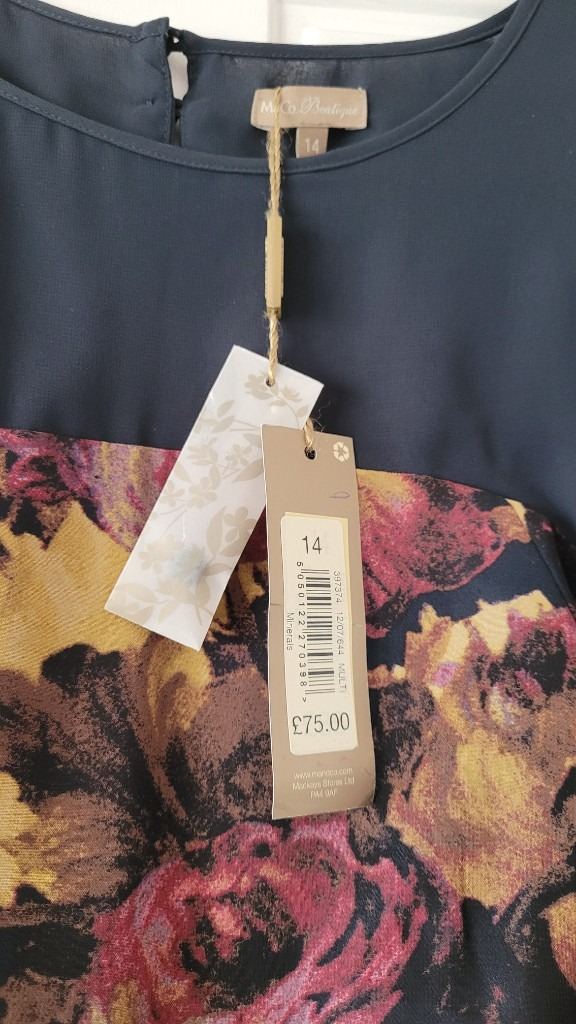 Beautiful M & Co Boutique dress size 14. BNWT. Bought for a wedding but never worn. Lovely material. Chiffon overlay, tried to show this in one of the pics. Lovely button detail on back with concealed side zip opening. Approx midi length. Belt is adjustable but could be removed to wear a different one if desired. Original price was £75 but would sell for £30 but open to offers for quick sale. Navy background colour with mustard and pink floral design.