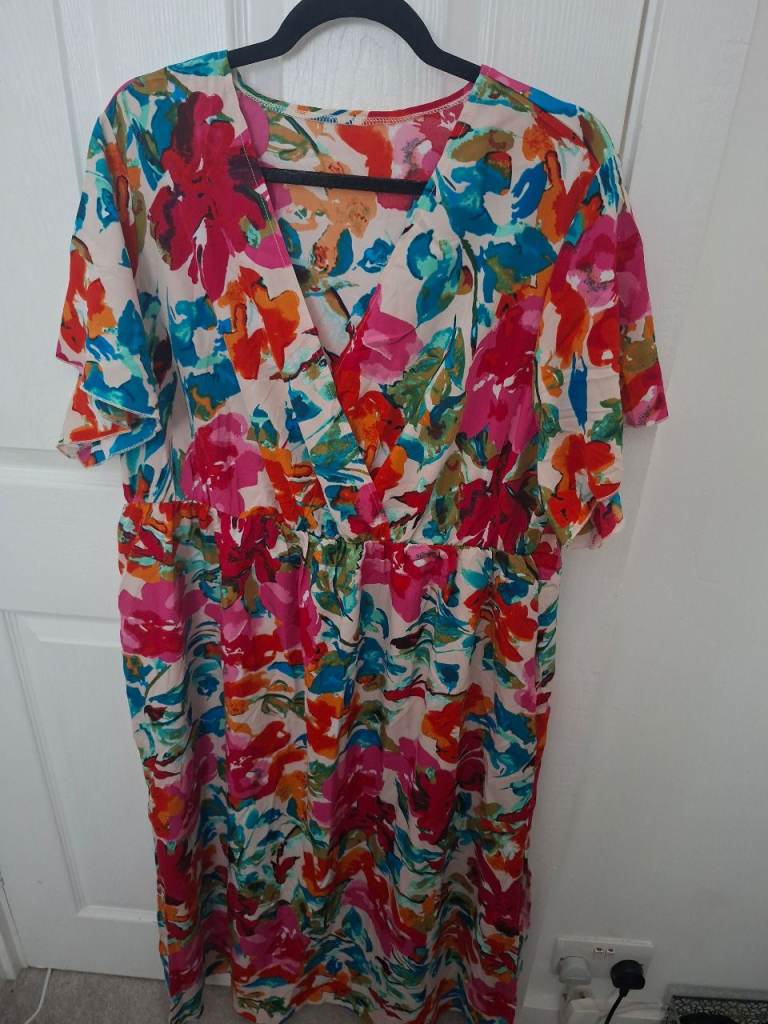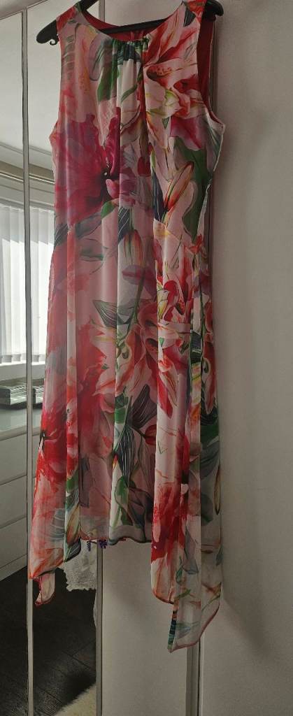 Ladies chiffon dress, size 14, pink floral, worn once, lovely on, very good condition, £20