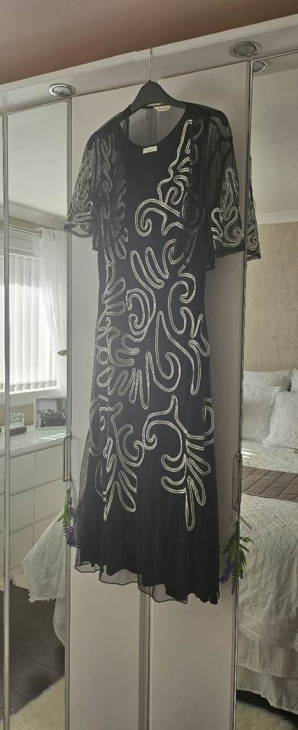 Ladies chiffon dress with matching chiffon bolero, black and cream, size 14, worn twice, £20