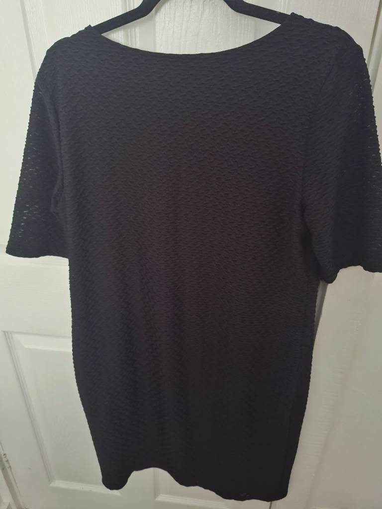 M&S Black dress with short sleeves and ruffle detail. Below the knee length. Size 16