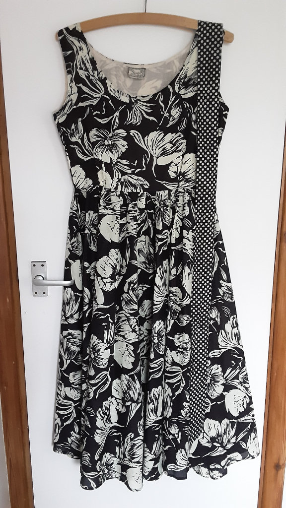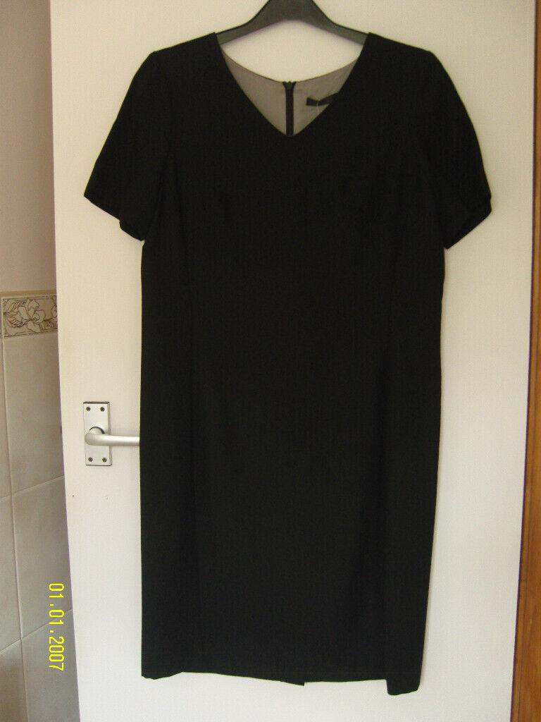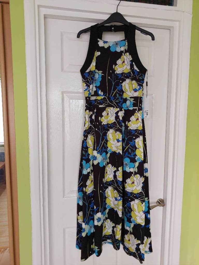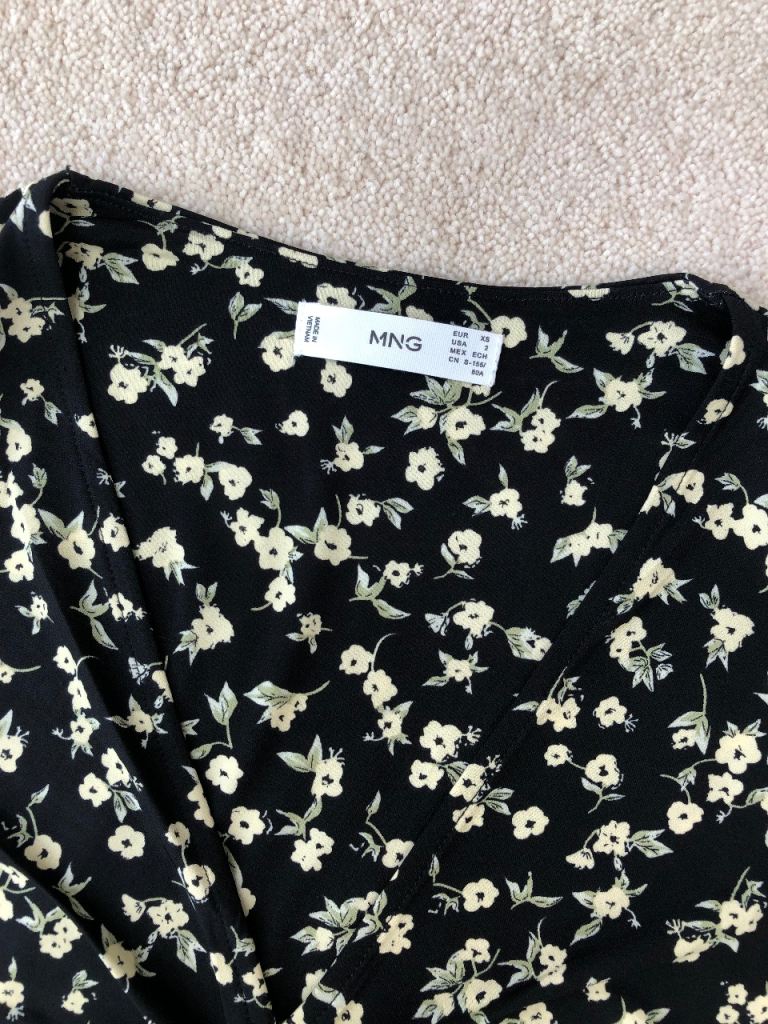 Long sleeve midi dress from Mango. Vee neck with ruching at bottom of the Vee. Fitted top going to an A-line skirt. Black background with small floral lemon pattern. Polyester in size 8 xs. Unworn perfect condition.