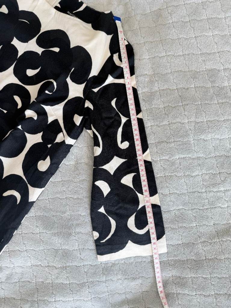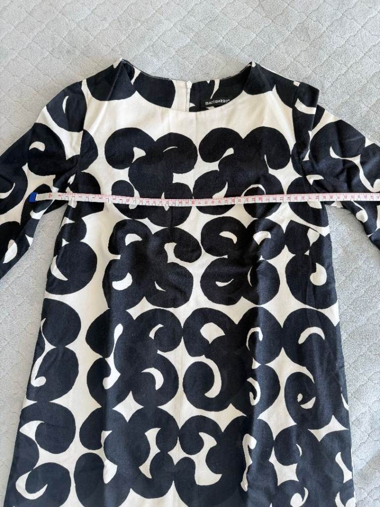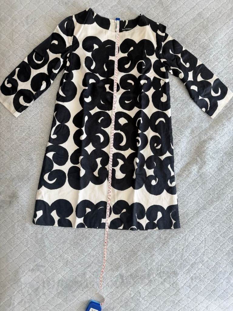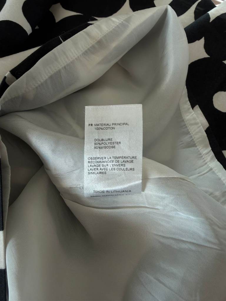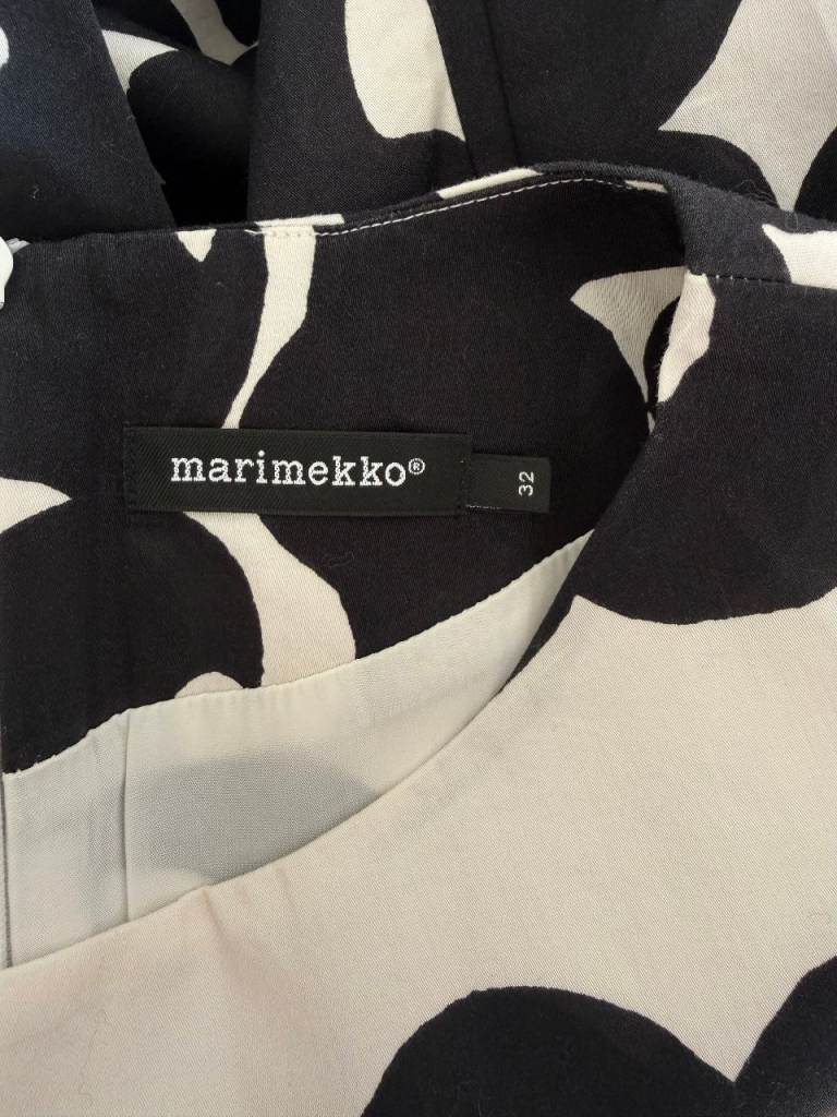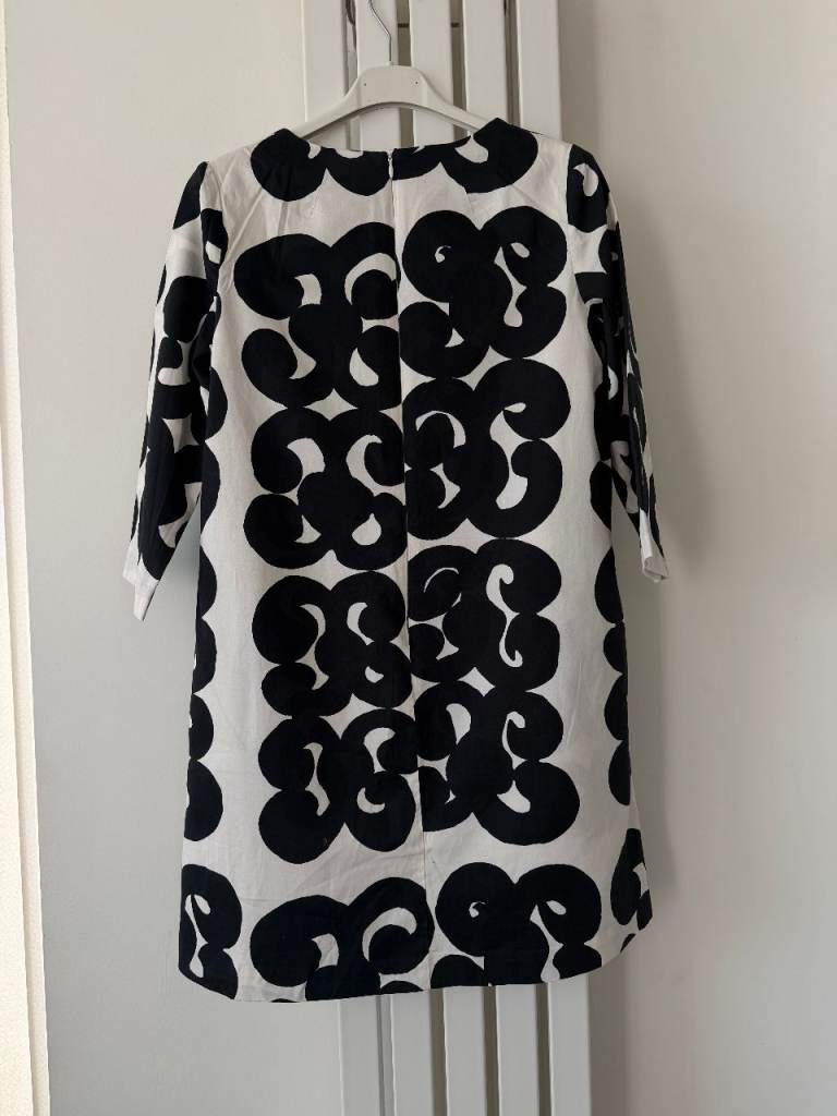 A stylish Marimekko cotton dress featuring the iconic “Garden” print designed by Annika Rimala in 1963. This piece showcases classic Scandinavian design with a bold black and white pattern and a clean, minimalist silhouette.