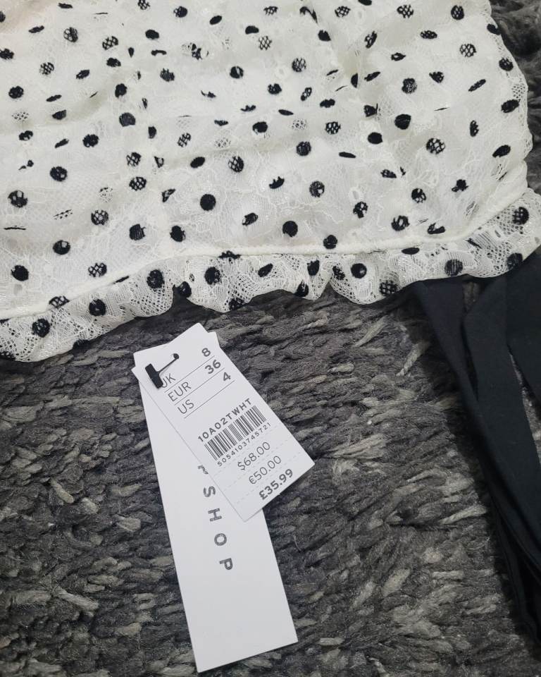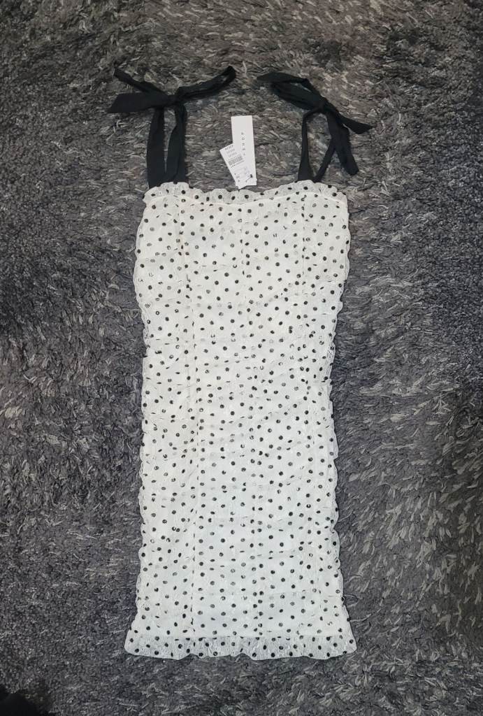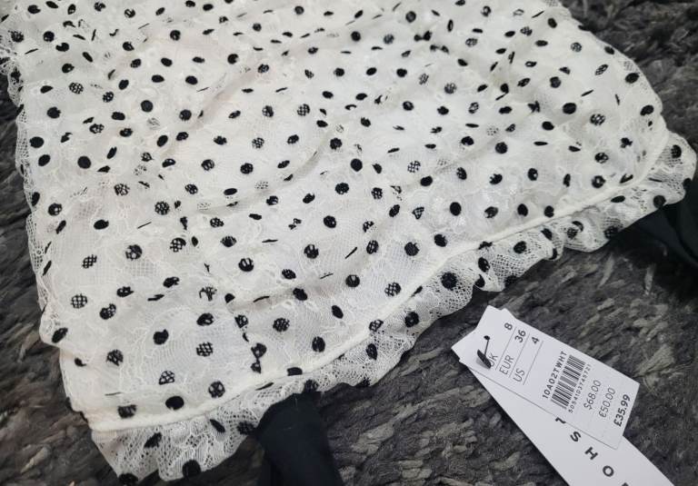 New Topshop white lace black polkadot mini dress size 8