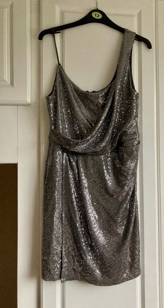 Silver sequins sassy asymmetrical party mini dress with shoulder detail back zip & wrap over style skirt size 12 worn once