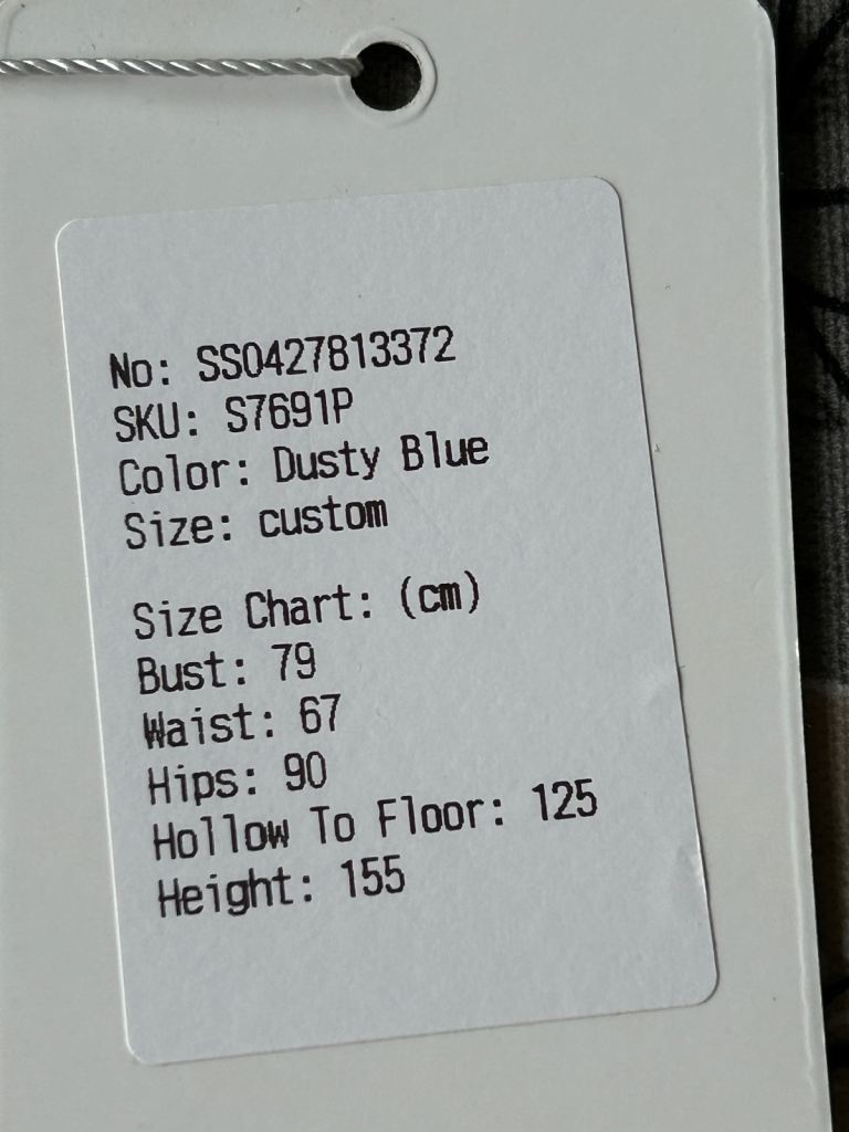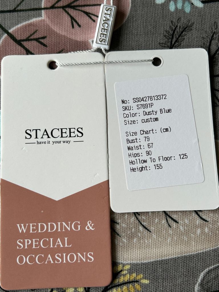 Made to fit: Bust 79cm; Waist 67cm; Hips 90 cm; Height 155cm (hollow to floor 125cm). Approx size 6/ XS