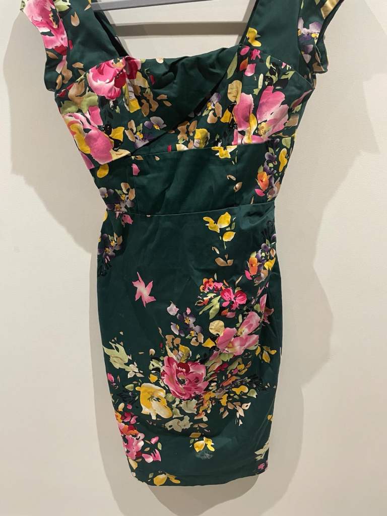 Design: Grass skirt style, knee length with decorative waistband and three floral embellishments