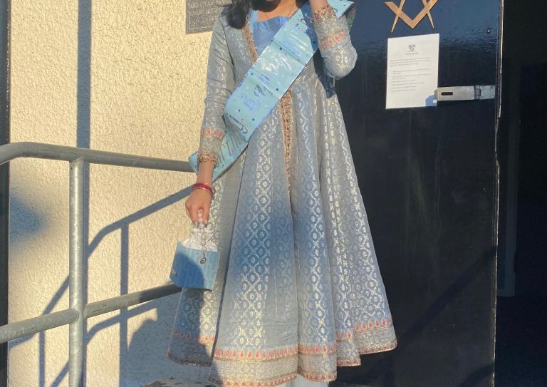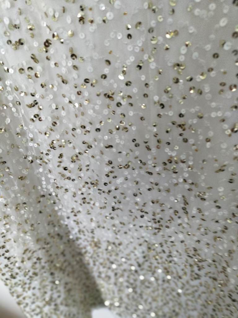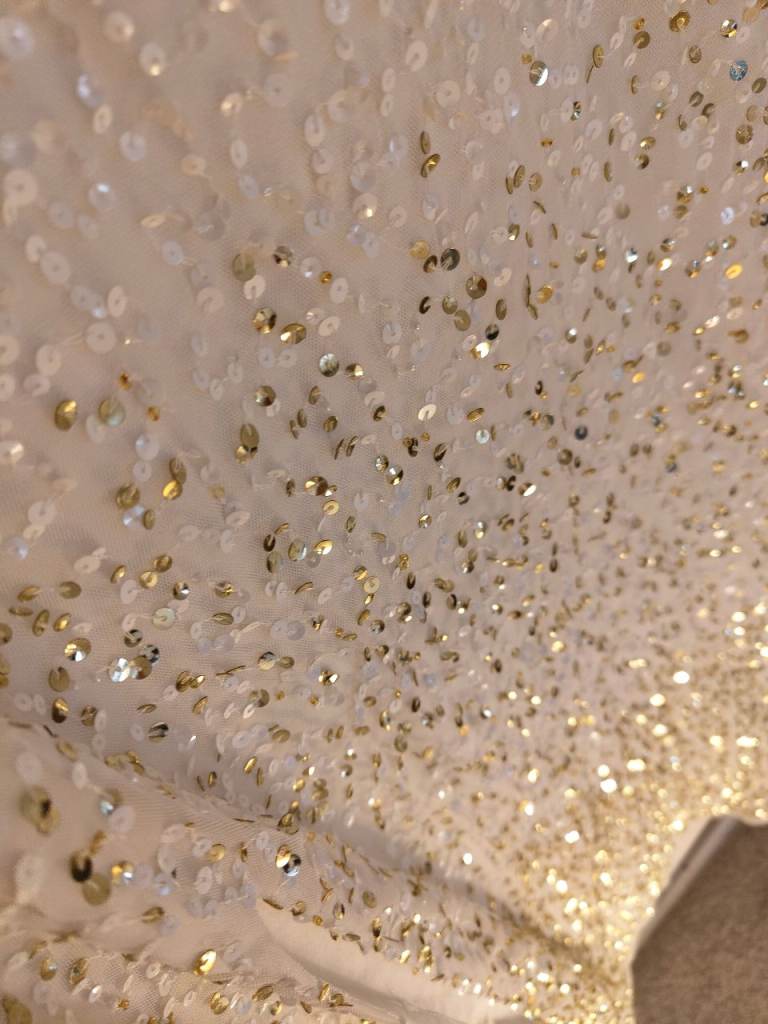 Ivory material with gold and white sequins, two tone & features a long sleeve design.