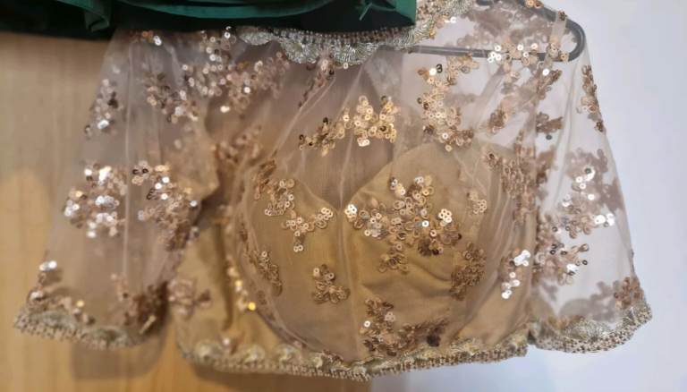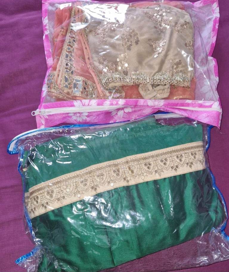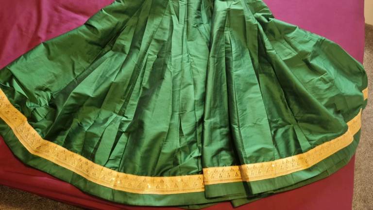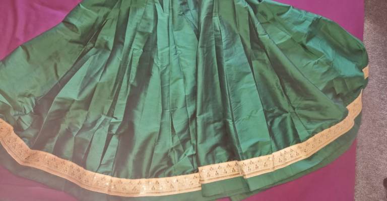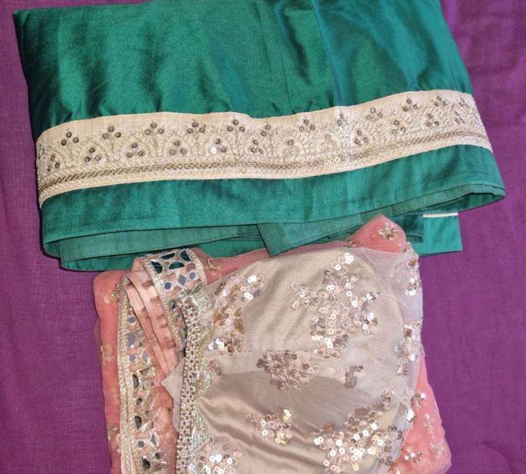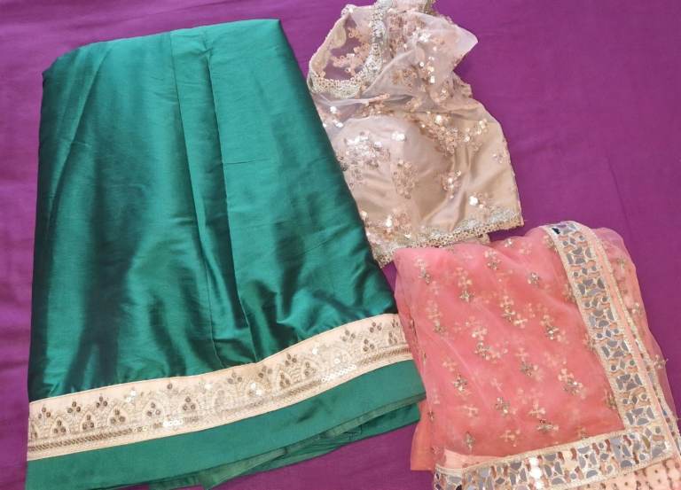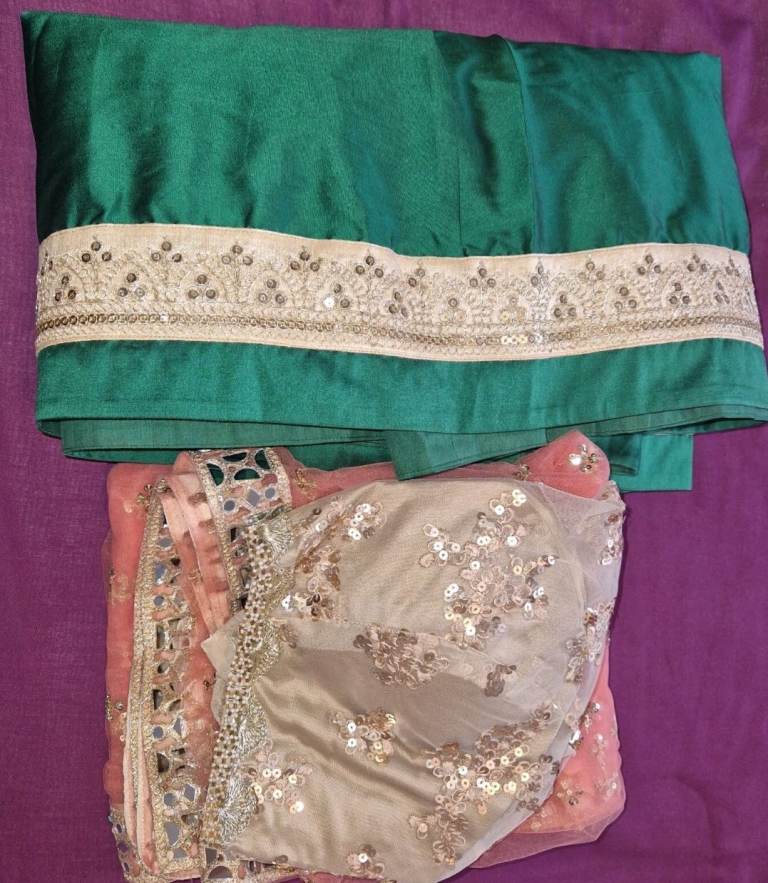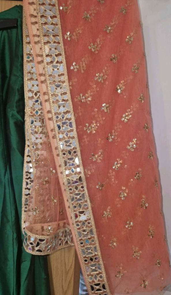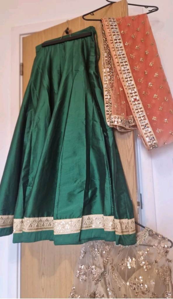 Green lahenga, ivory/cream choli and Peach dupatta.