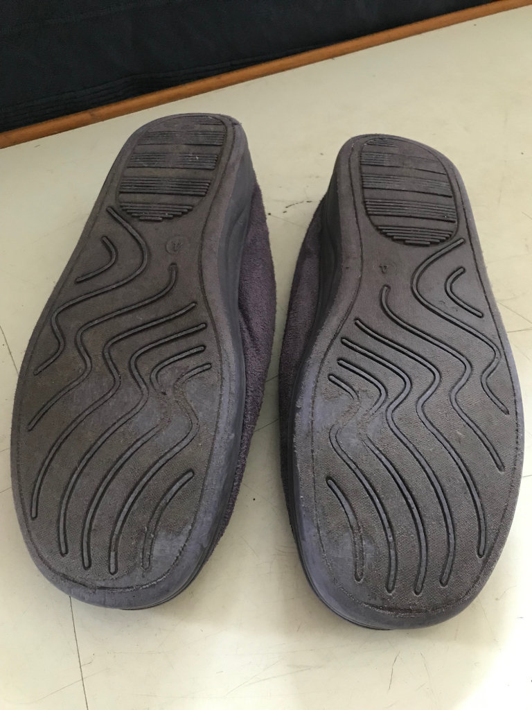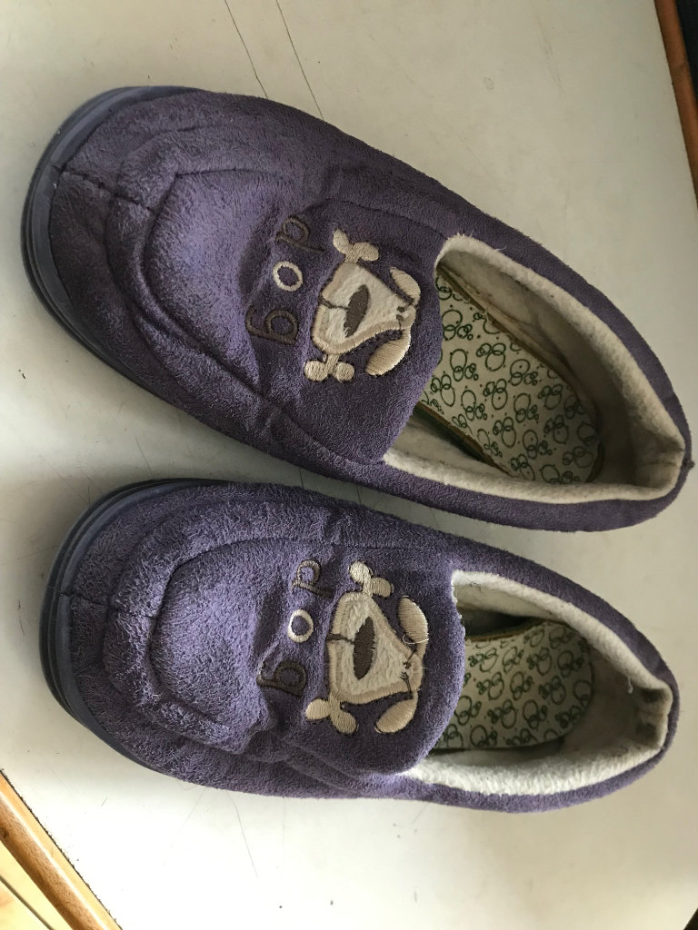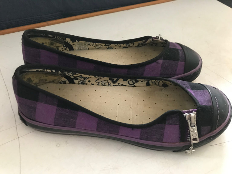 1)Pre-loved pair of 'Rocket Dog' Black/ Purple Check Flat shoes with zip on side- Size 4 - Condition - Very Good + 2) Pre-loved Purple 'Dog' Slippers - Condition -Fair