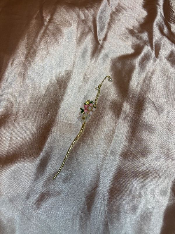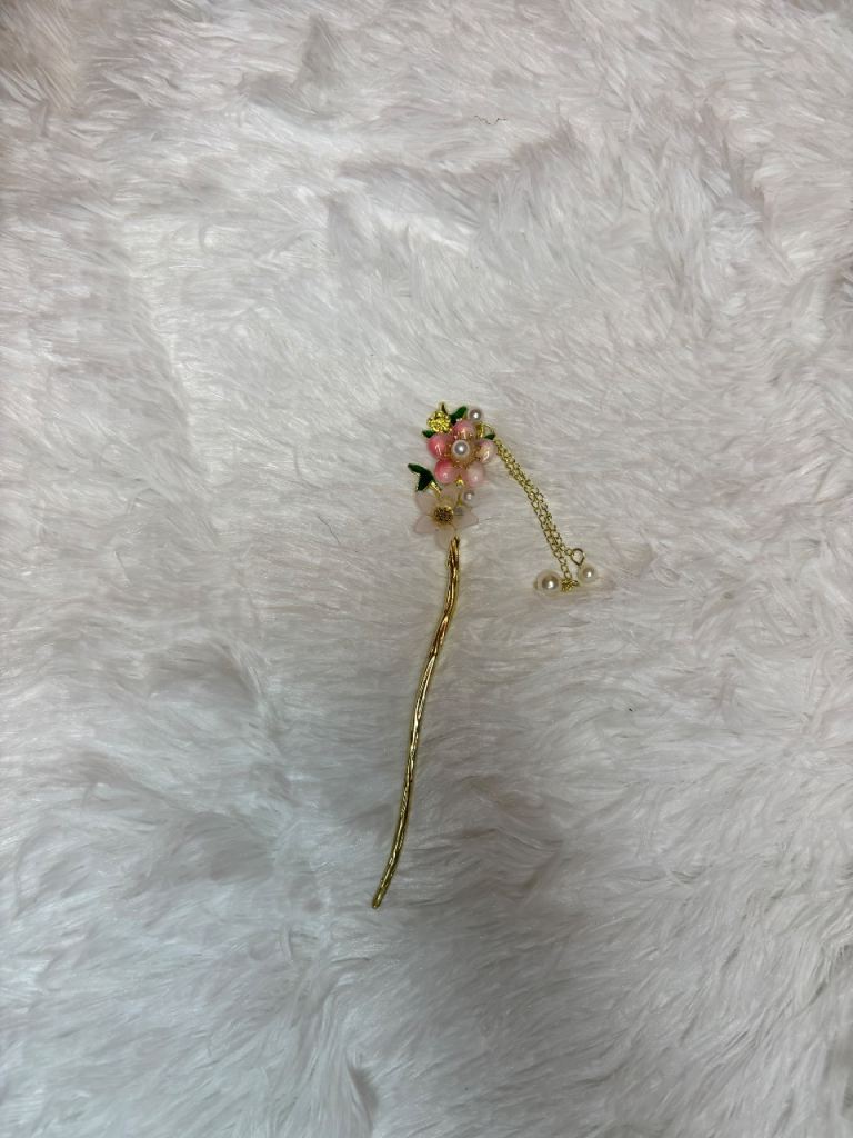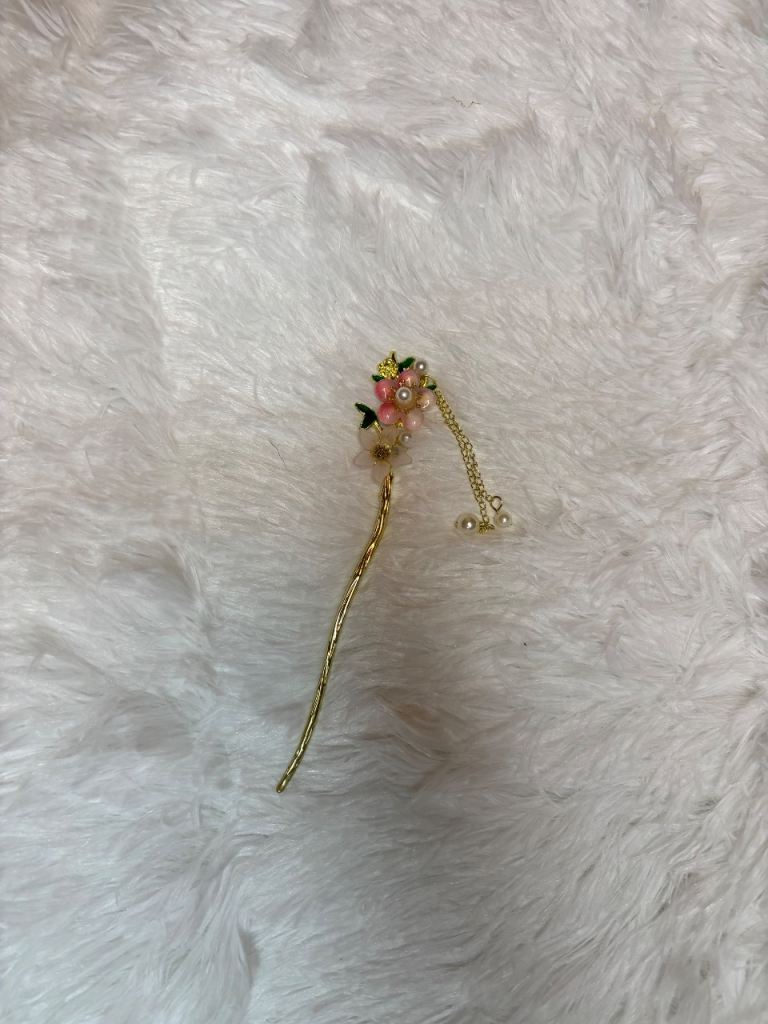 This item is a traditional Chinese-style hair stick adorned with pink floral details, faux pearls, and a decorative tassel.