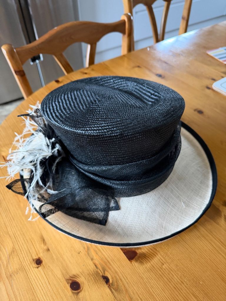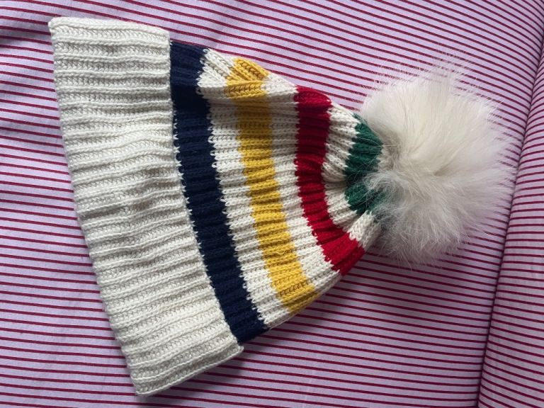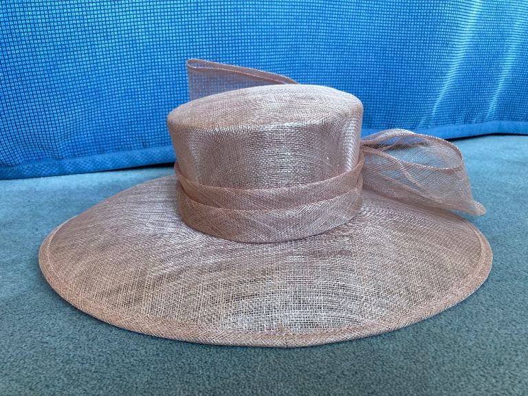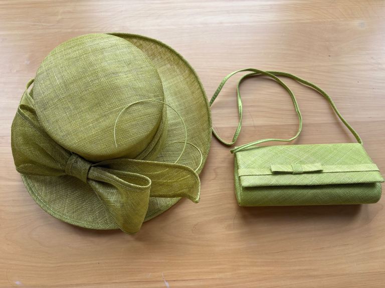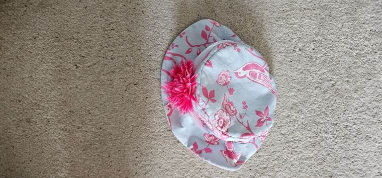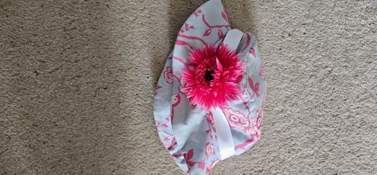 Professionally made cotton hat and bag for sale. White pink blue flower pattern.