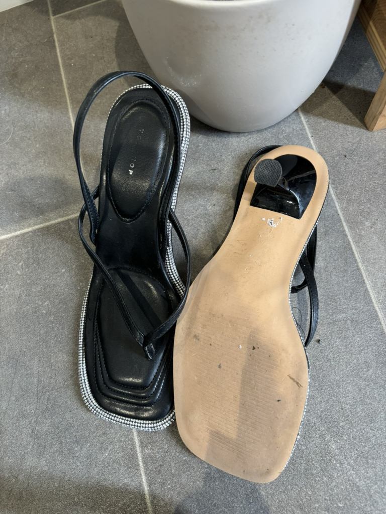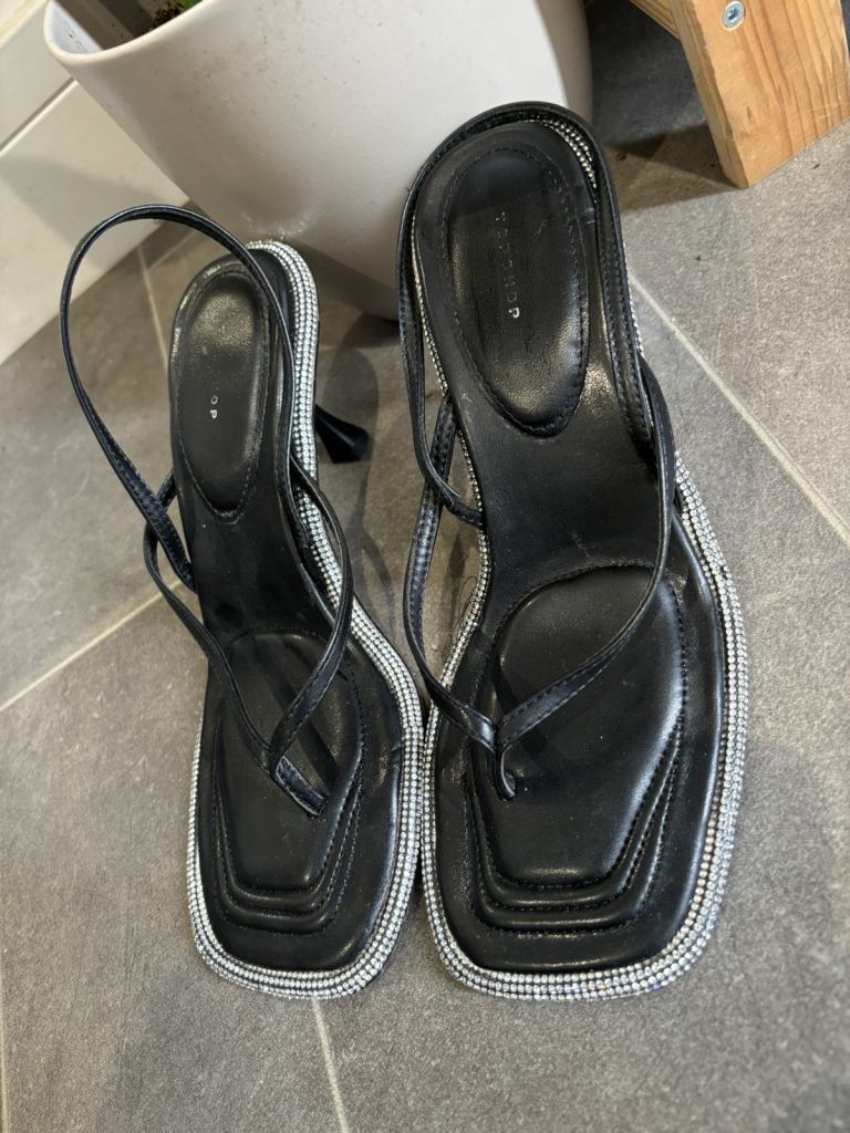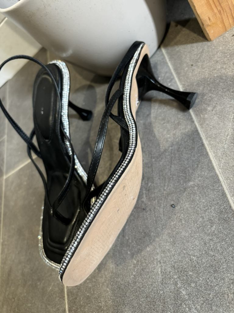 Women’s black mini high heels with adjustable straps gems details around the shoe with padding stylish, comfortable worn a few times