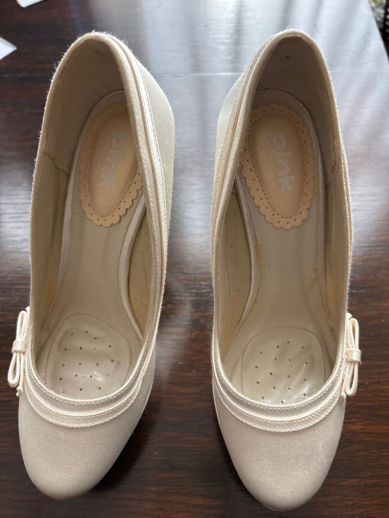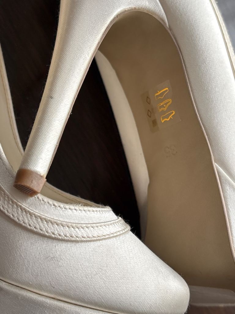 As seen in the photos; never worn. Platform heels. (Could make as wedding shoes!).