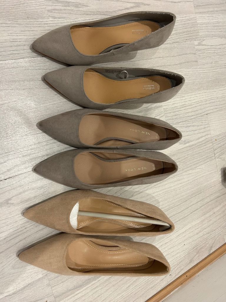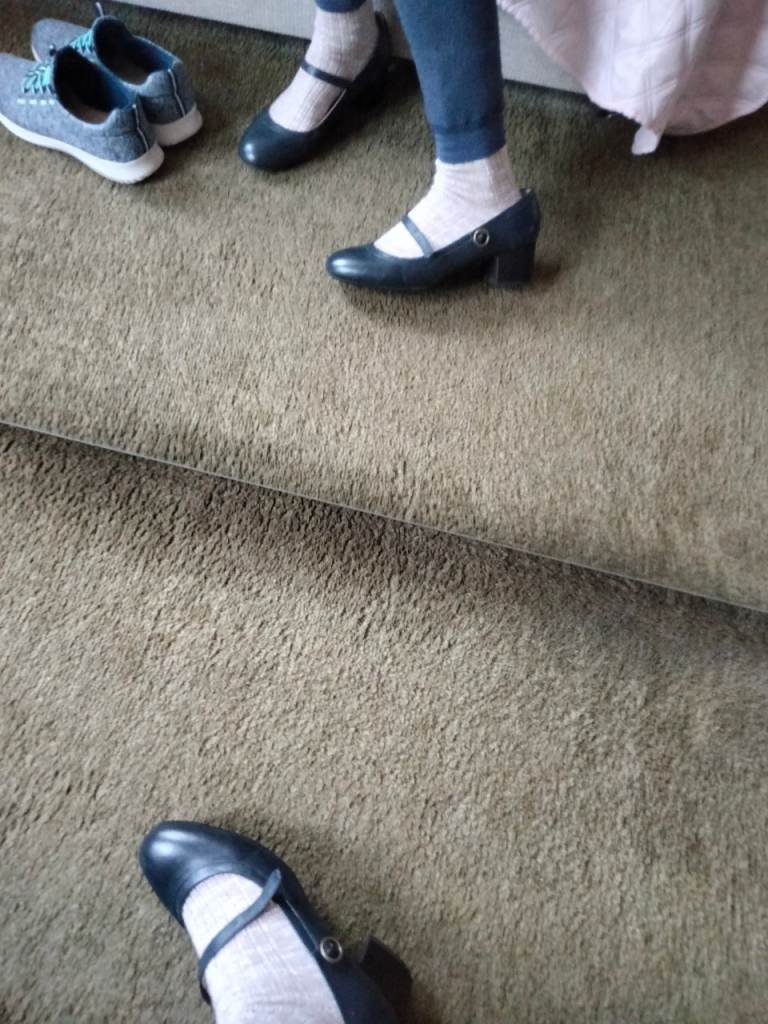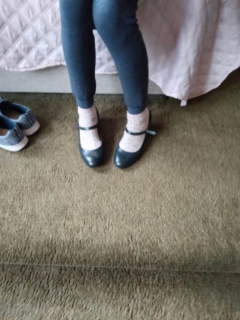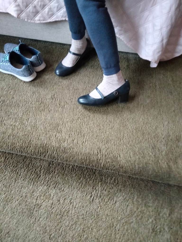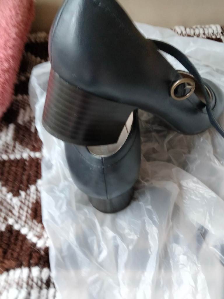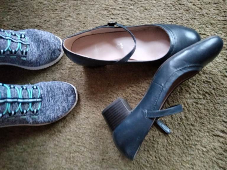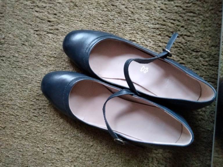 Navy 6 and a half bar shoes undoable strap, rubber soles , very stable brown heel two inch heel.Broad fitting. Make Footglove. Central Norwich Nr13LF Surrey Street wide fitting.Navy with brown heel