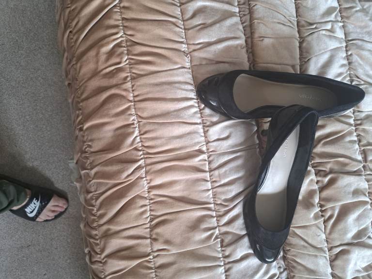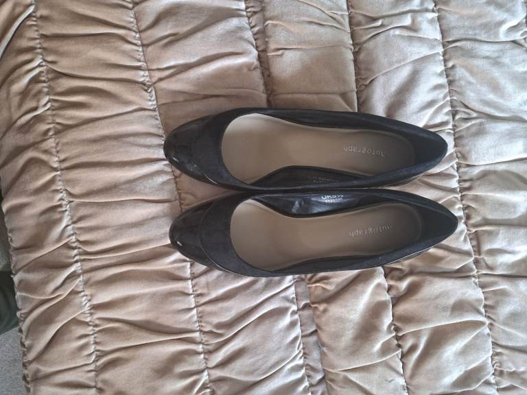 M and S Autograph ladies black patent and suede shoes. Size 5.1/2 with pewter coloured kitten heel. Worn once, excellent condition. Non smoking non animal house