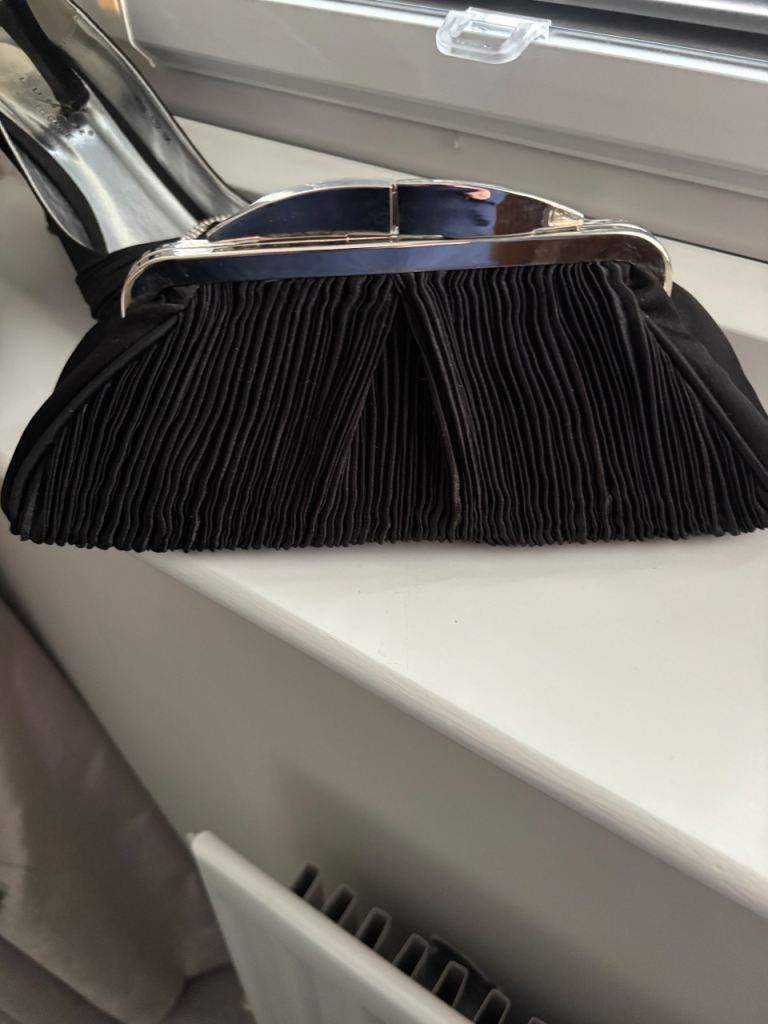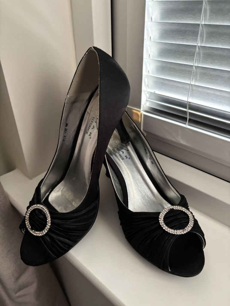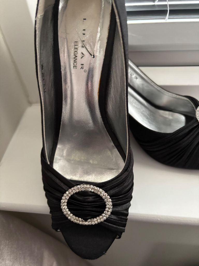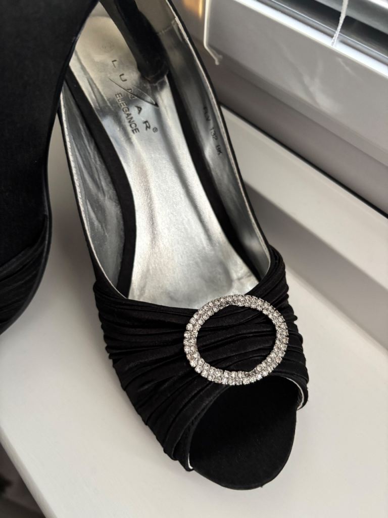 Lovely set of black peep-toe heels by Lunar Elegance with a matching clutch bag.