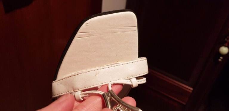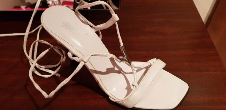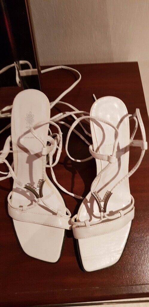 NEW - WHITE LEATHER STILLETOS WITH 11 CM HEEL AND DIAMANTE DETAIL ON THE ARCH OF THE FOOT. UK SIZE 5.