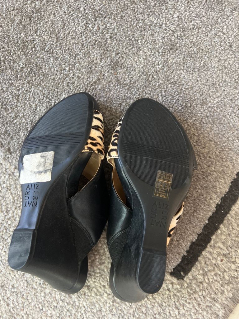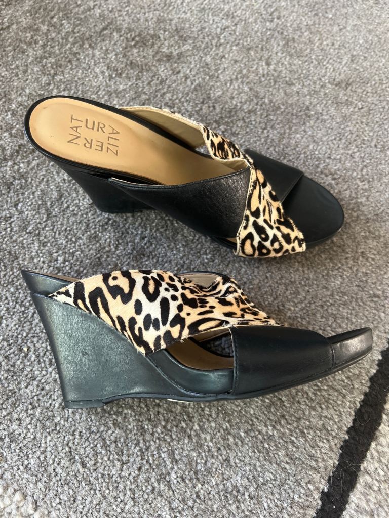 Sandels slip on with leather wedge heel, black with faux ocelot front. Size 5 brand new £6.00 buyer to collect or pay postage.