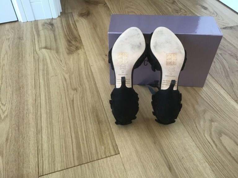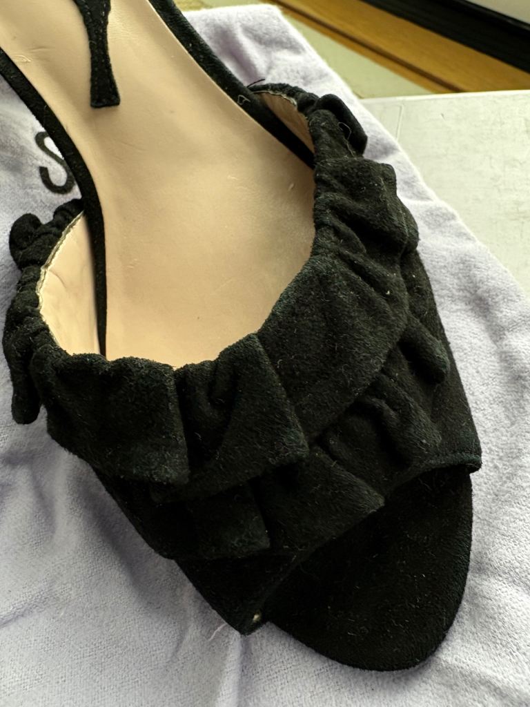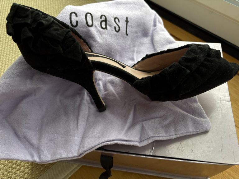 Black suede Coast shoes, hardly worn, heel approx 2”. Frill detailing front and around heel. Real leather soles. Size 6 (39).