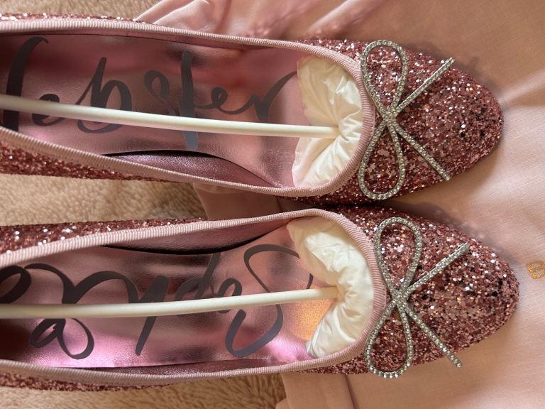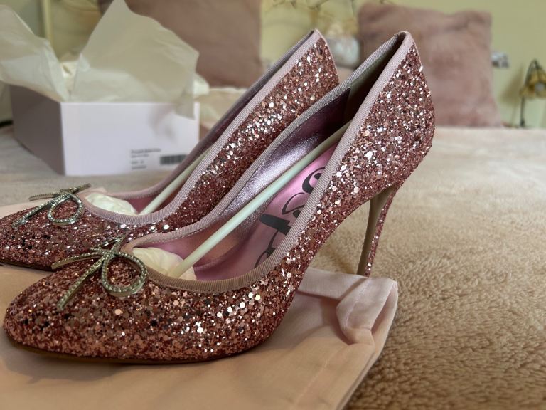In box with distant and never worn.Gorgeous pink glittery heels with silver bow,size 6.