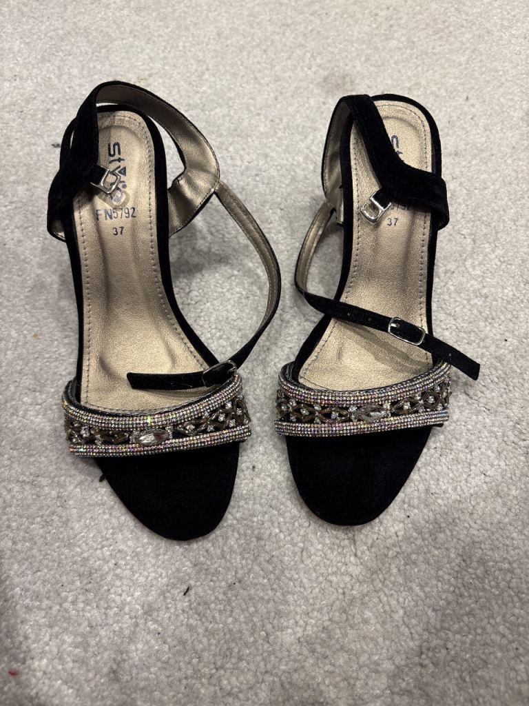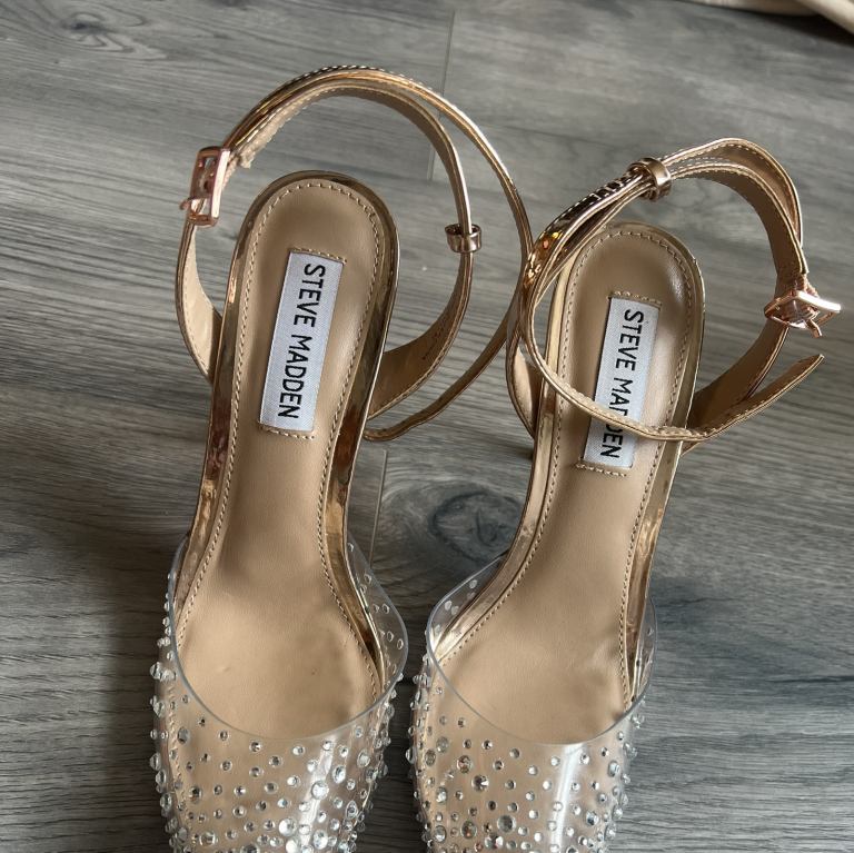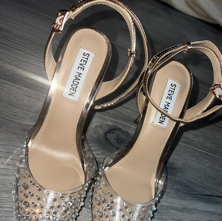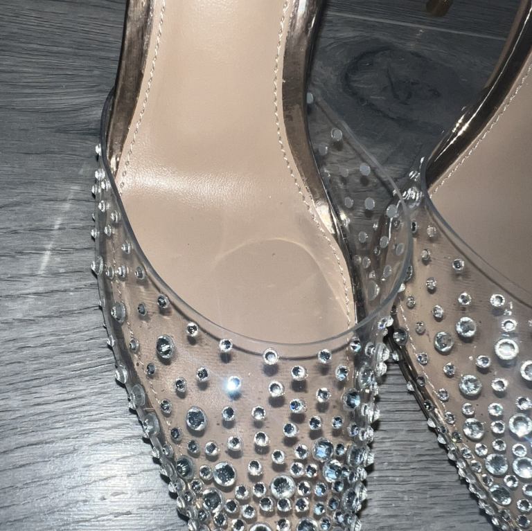 The transparent upper covered with rhinestones gives this heel a super chique look. Will look beautiful and match with any floral or