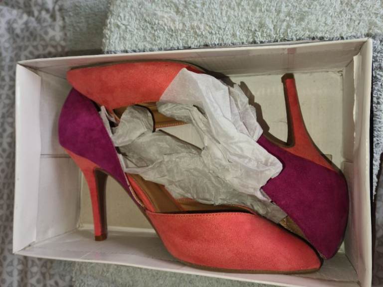 Stunning two colours suede high heels court shoes uk8 boxed worn once Indoors. Please see my feedback for reassurance that my item descriptions are accurate. See photos for condition size flaws materials etc. I can offer free local delivery within five miles of my postcode which is LS104NF. I am also in Wakefield on Monday, Wednesday and Friday lunchtimes so free delivery possible around Wakefield but Strictly with mutually agreed terms prior to end of auction/ sale. i can offer postage at extra cost which is via Royal Mail