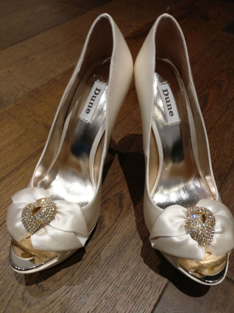 Beautiful, stunning open toe platform sandal finished in Ivory Satin with Bow, Gold & diamanté detail. Selling with original box. Worn once to wedding. Immaculate condition