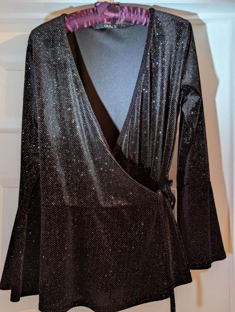 QUIZ Sparkly wrap around jacket with tie belt and slightly flared sleeves, size 10-12.