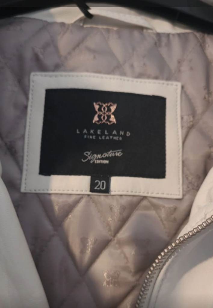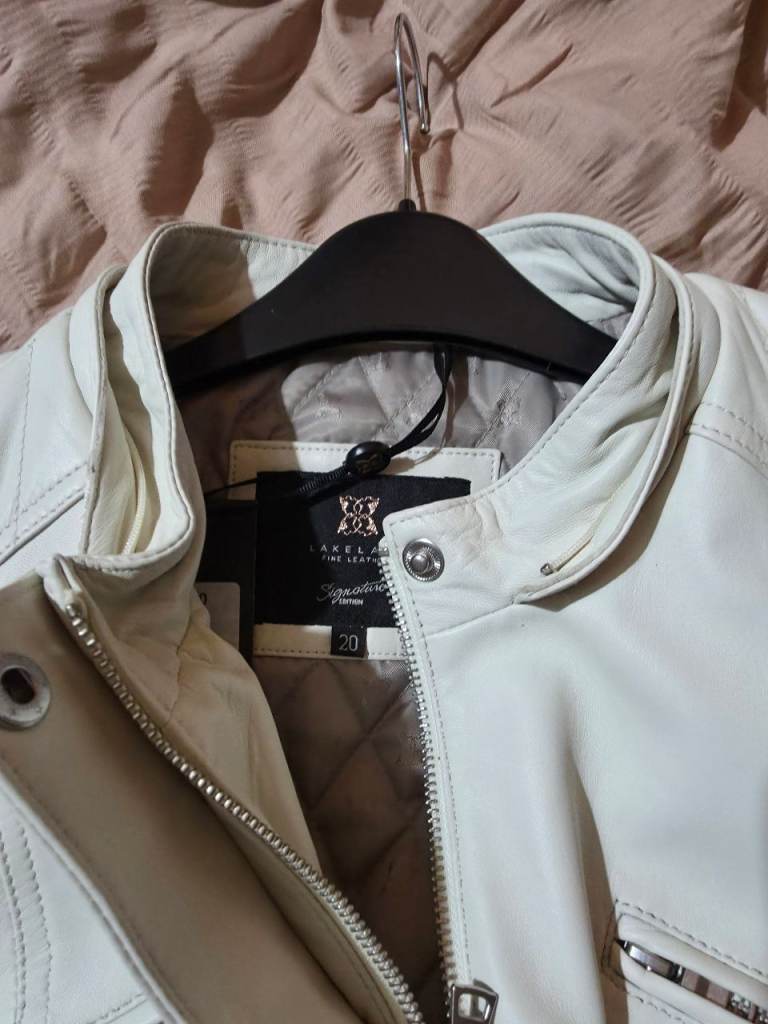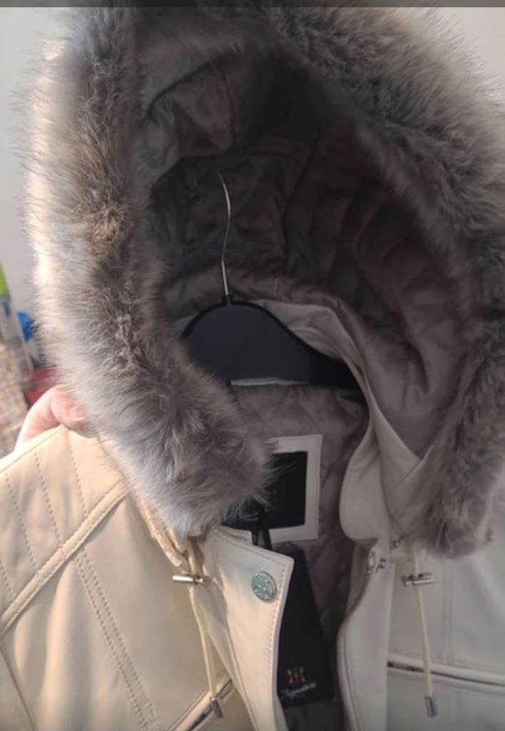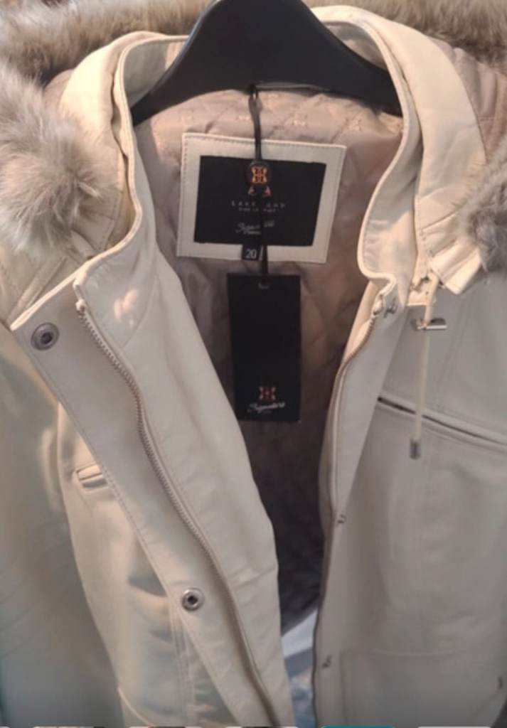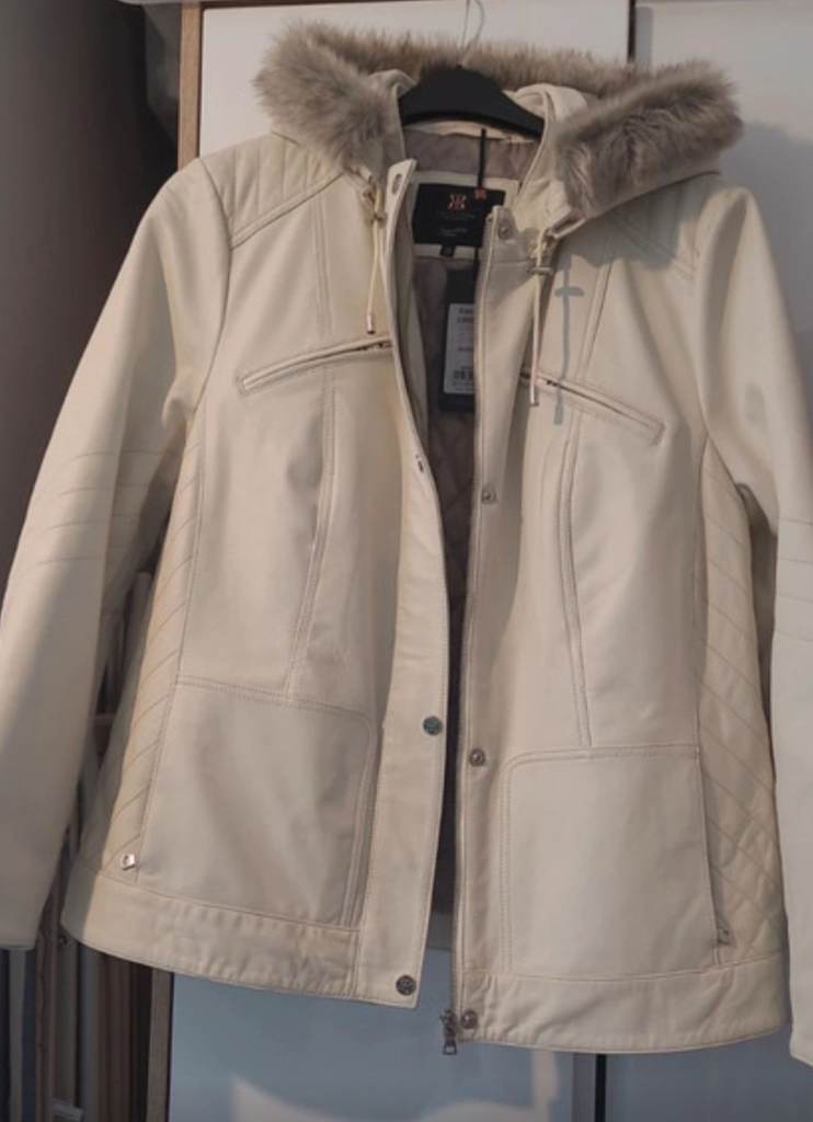 This is a lovely cream Lakeland Fine Leather jacket with fur zip hood. Whivh can zip off. It has Thermore insulation to keep you warm. It also has 4 zipped pockets. The Jacket has never been worn and still has tags the on. Size 20