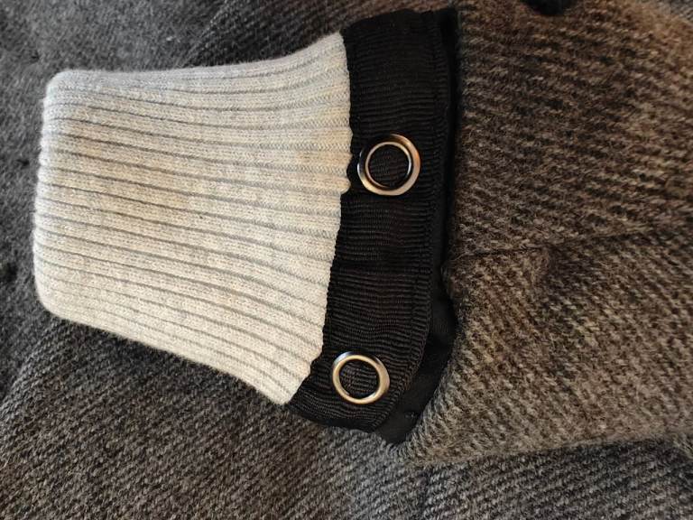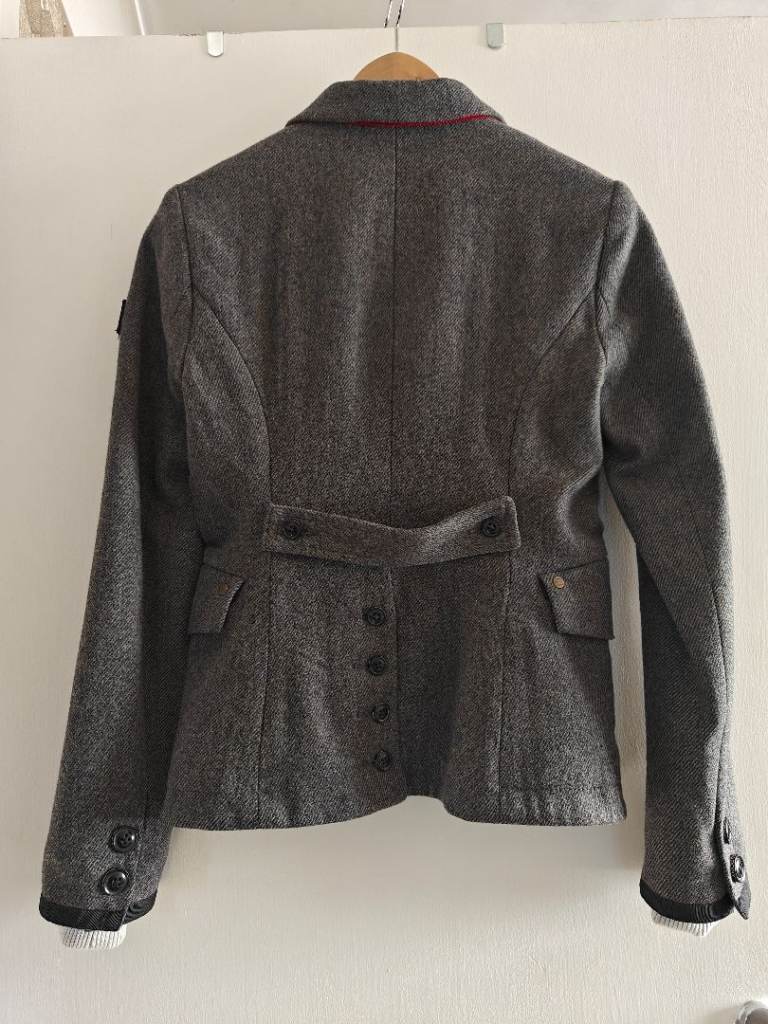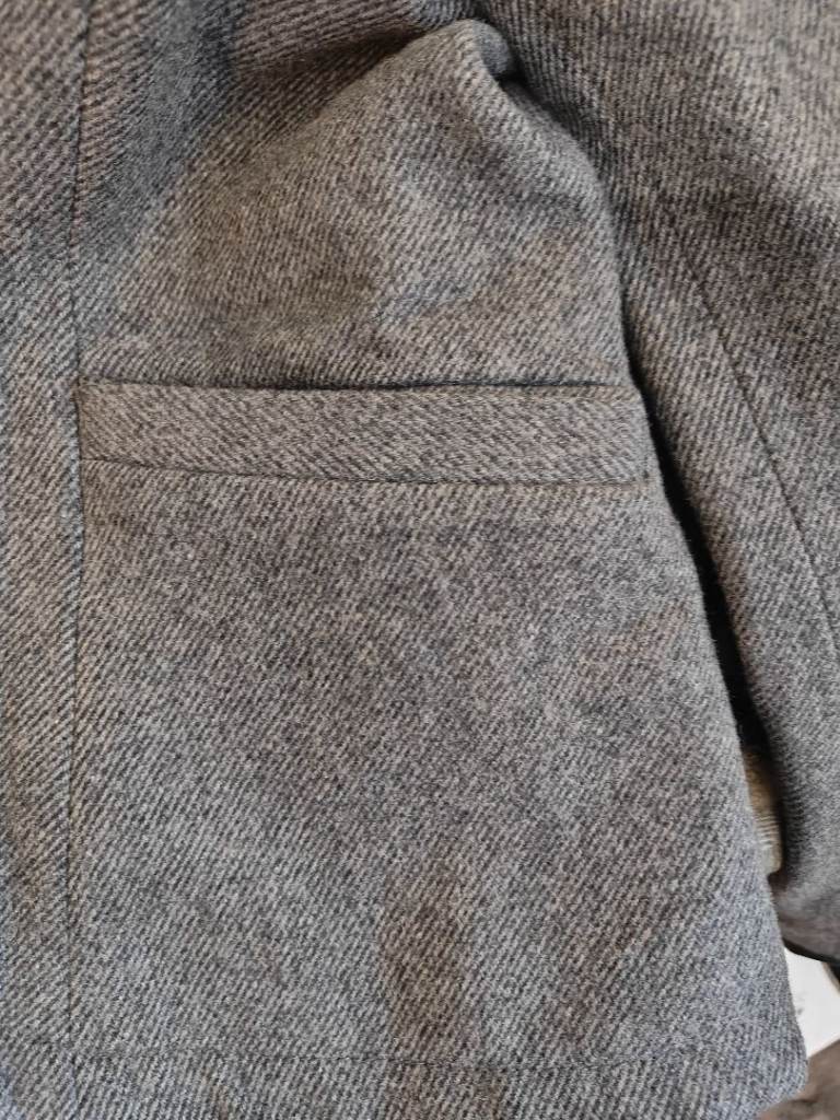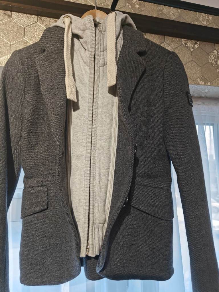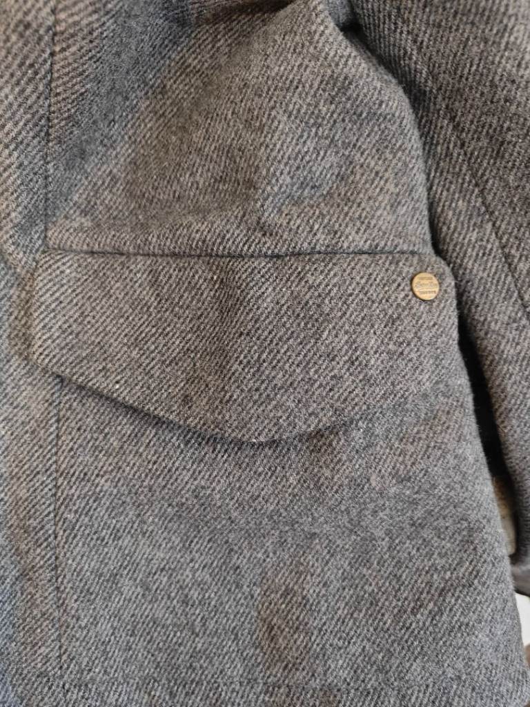 Wool blend Herringbone Tweed jacket, fully lined, as new and in mint condition. Detachable hoodie, front insert and cuffs.