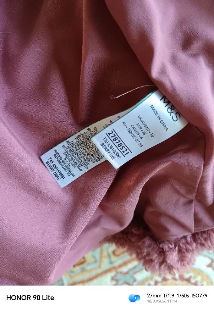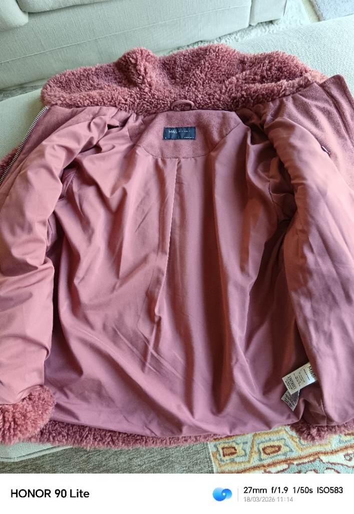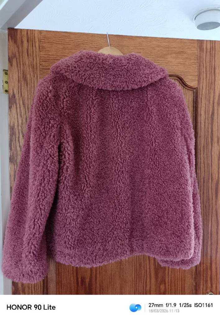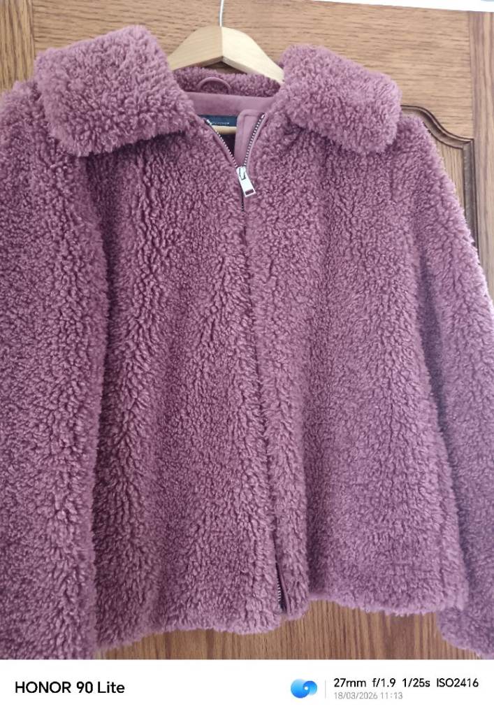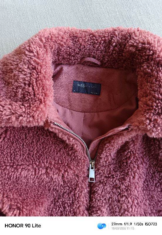 M & S soft, warm furry jacket.. Rose pink colour, really nice soft deep fleece material with silky lining. Warm, but light to wear. 2 side pockets, and one hidden inside pocket. In perfect, clean condition, no damage. Hardly worn. Size 10. Loose style so may suit a 12 also.
