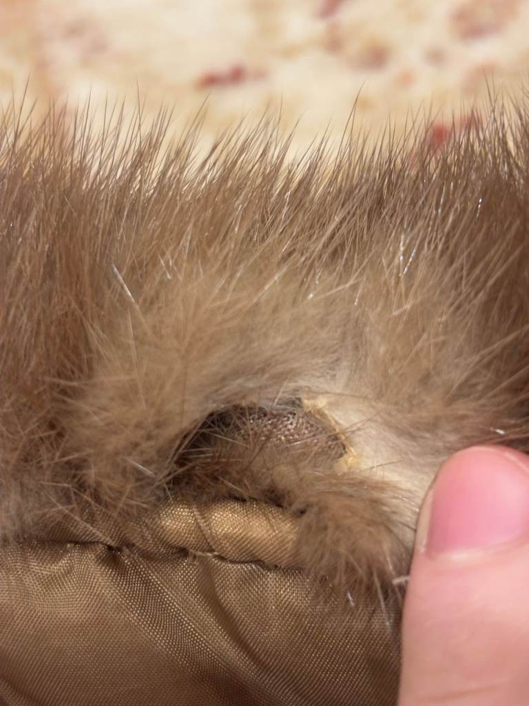There are two small holes on the inside of the coat lining but they are tiny, and one of the middle hook and eyes has come off but the other two hook and eyes mean it still does up and is perfectly functional.