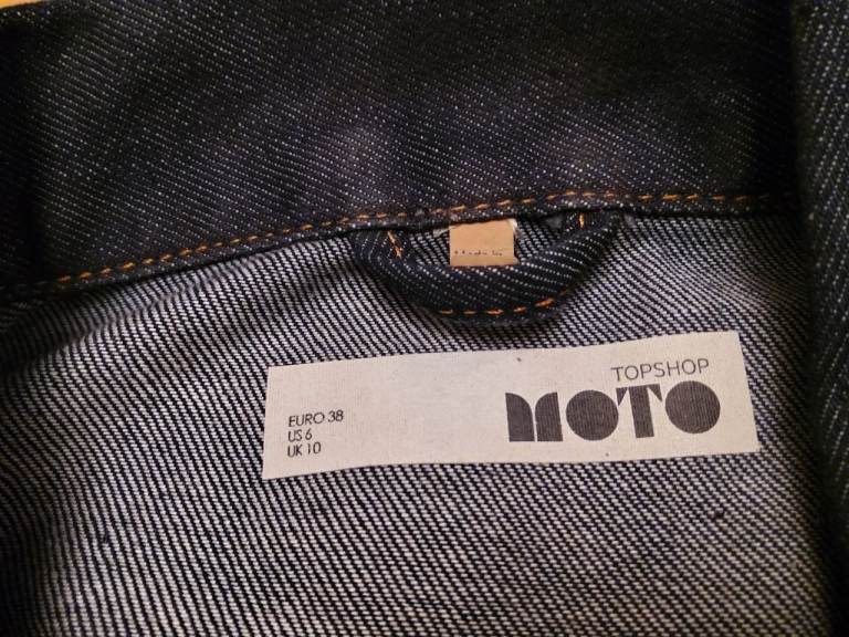 Pre owned but immaculate condition throughout. Moto from Topshop Dark Denim classic style ladies jacket. Size 10