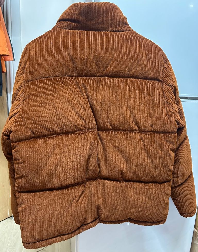 The Topman brown corduroy puffer jacket in size small offers a stylish and practical addition to any winter wardrobe.
