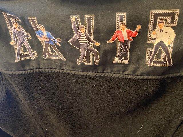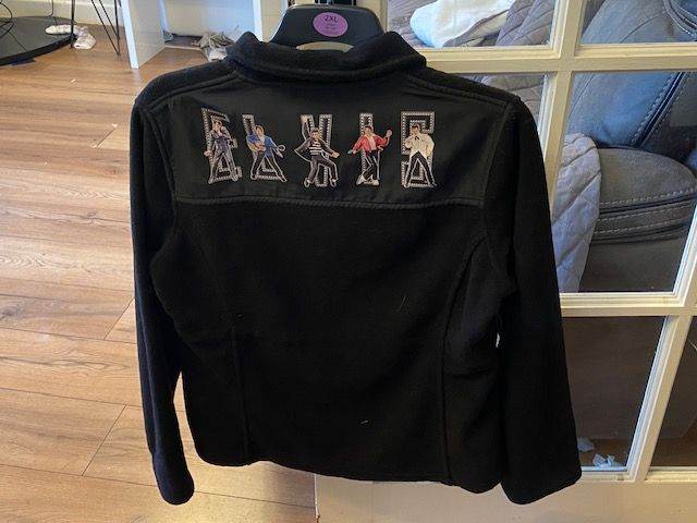 This is a Bradford Exchange Lady's fleece and made from top quality material. The front name of Elvis is embroidered. Zip has TCB charm to unzip. Zips to pockets have guitar charms.