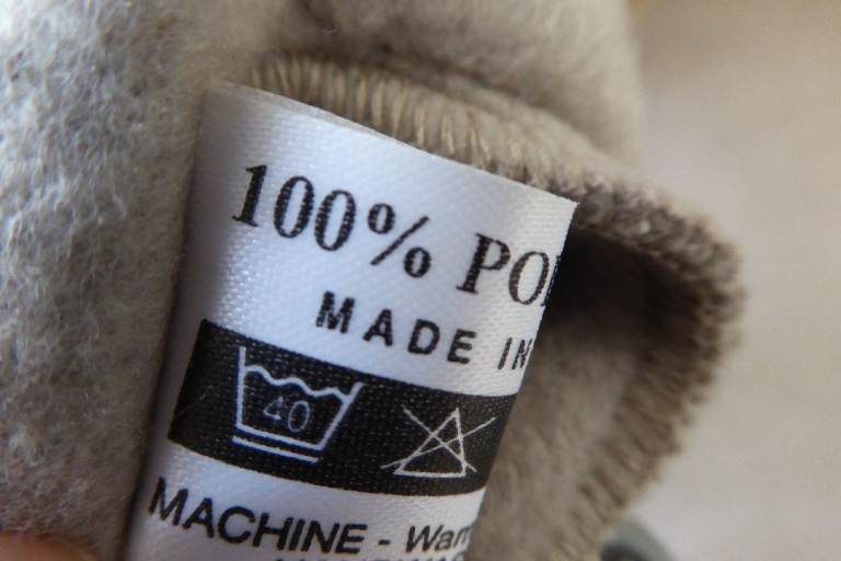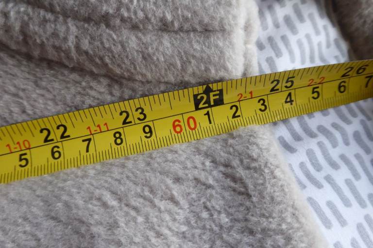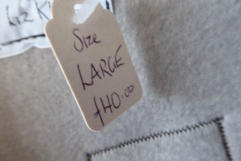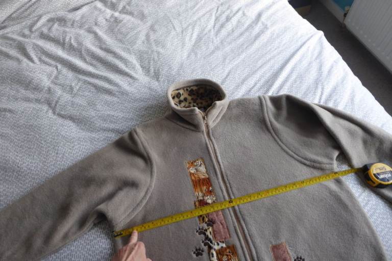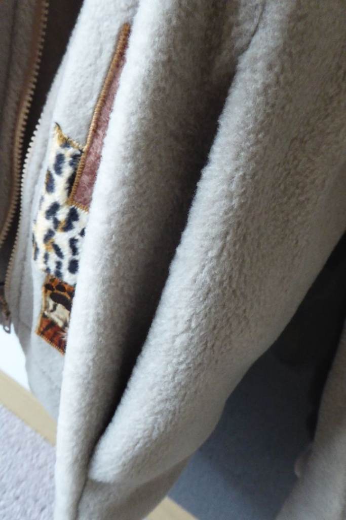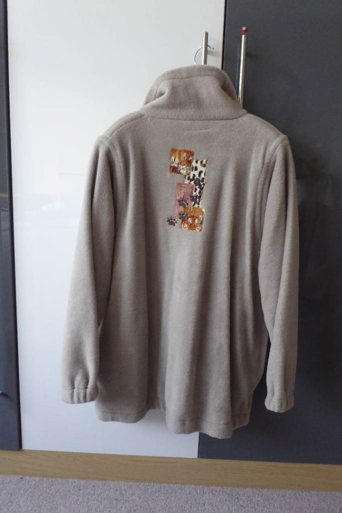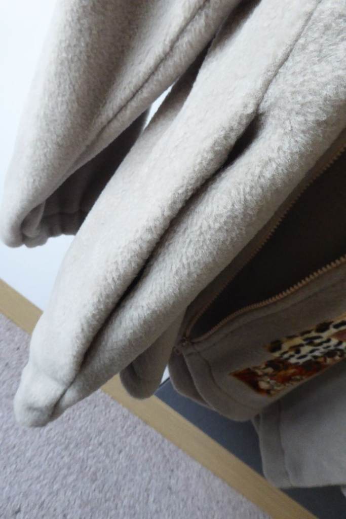 Soft beige fleece with zip front, and two side pockets.