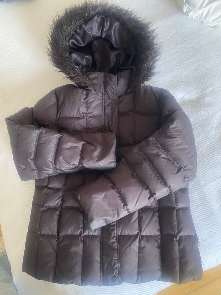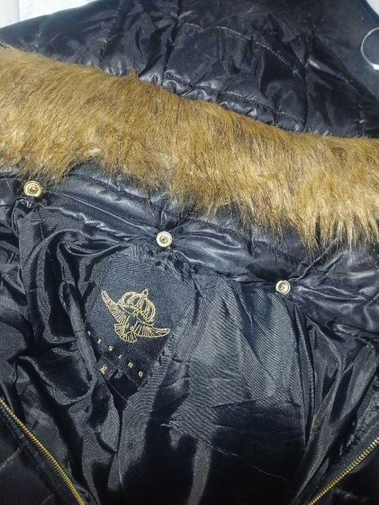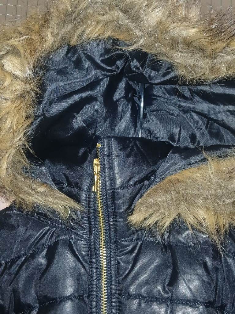 Black lightweight puffer jacket with a detachable fur hood. Great for casual wear or walking the dog.