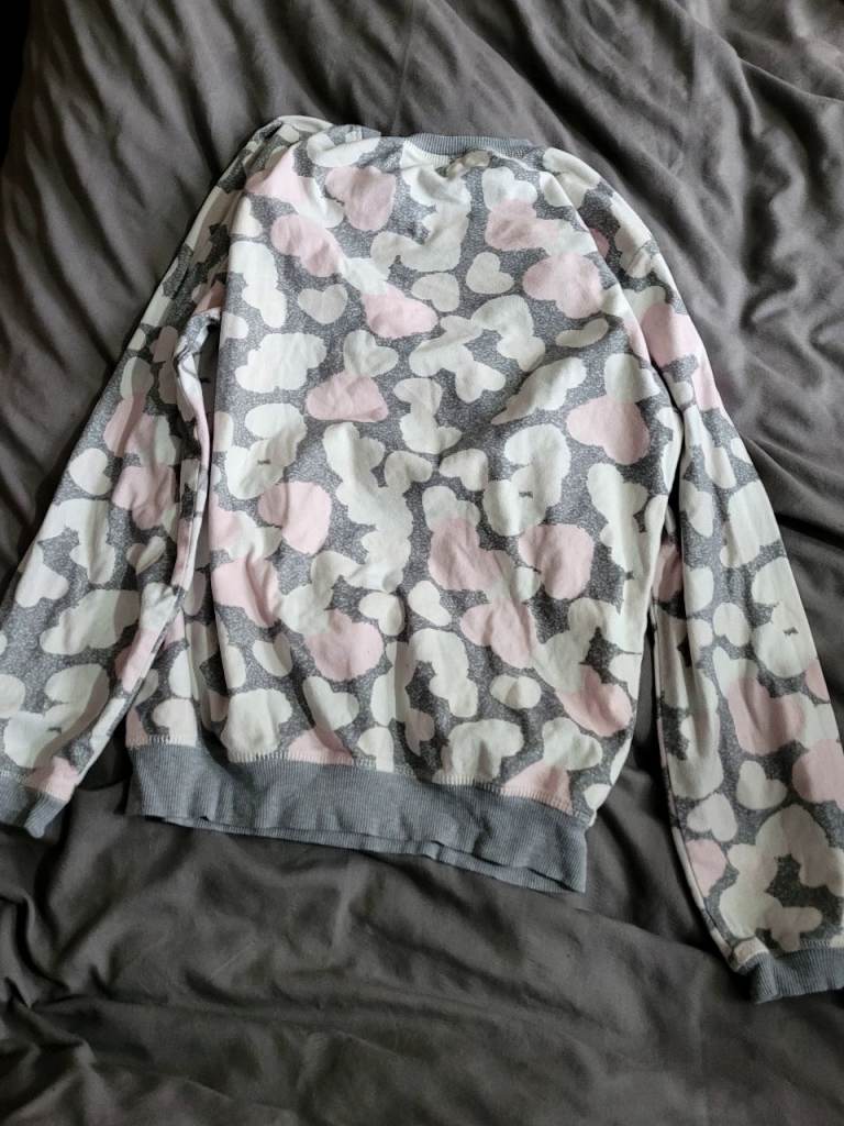 Avenue. Women's Pink and Grey Heart Print Jumper - Size 10 - Preloved