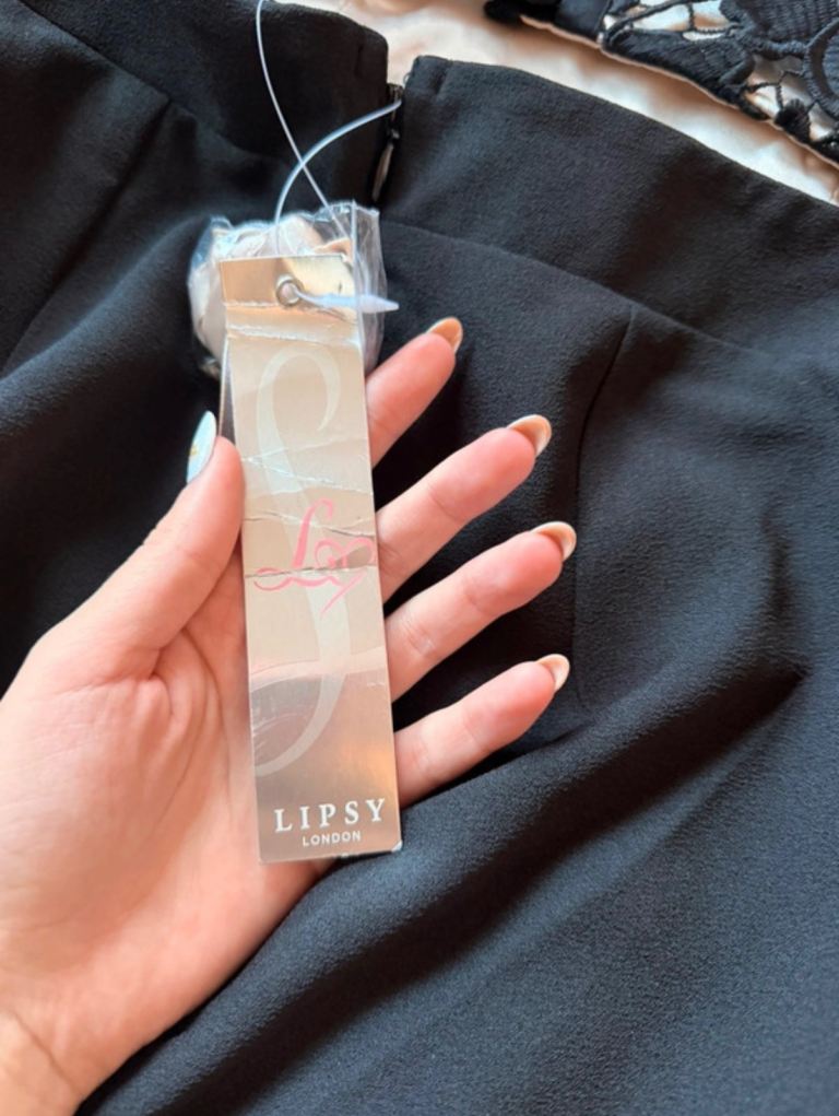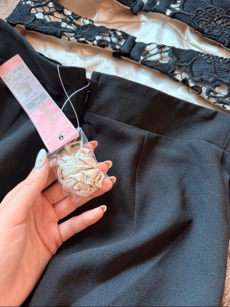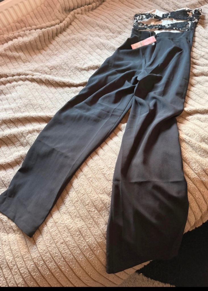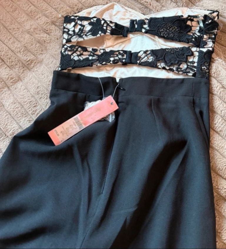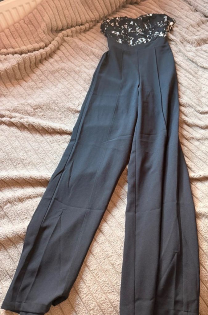 Strapless jumpsuit with a black base colour and a contrasting lace embellished bodice.