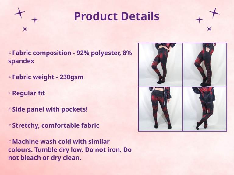 - Fabric composition - 92% polyester and 8% spandex.
