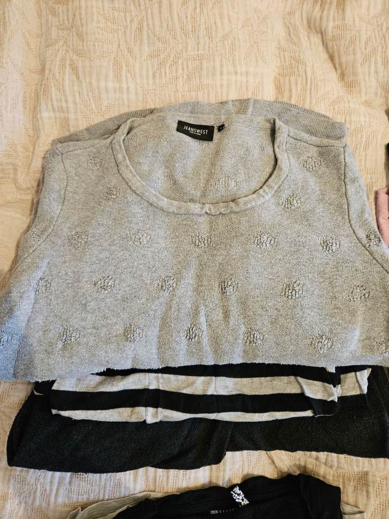 Huge bundle of Maternity wear and feeding tops, basically your whole Maternity wardrobe! 3 jumpers, 3 tshirts, 4 maternity vests, 5 feeding vests, 8 long sleeve and 3/4 sleeve tops, 1 pair of super comfy jeans and one hoody with middle zip out so can wear when pregnant and then zip baby inside in a sling or front pack. Variety of brands, most H&M. All in great, clean condition, no stains, holes. From pet free and smoke free home.