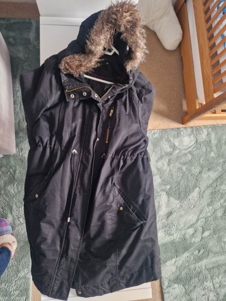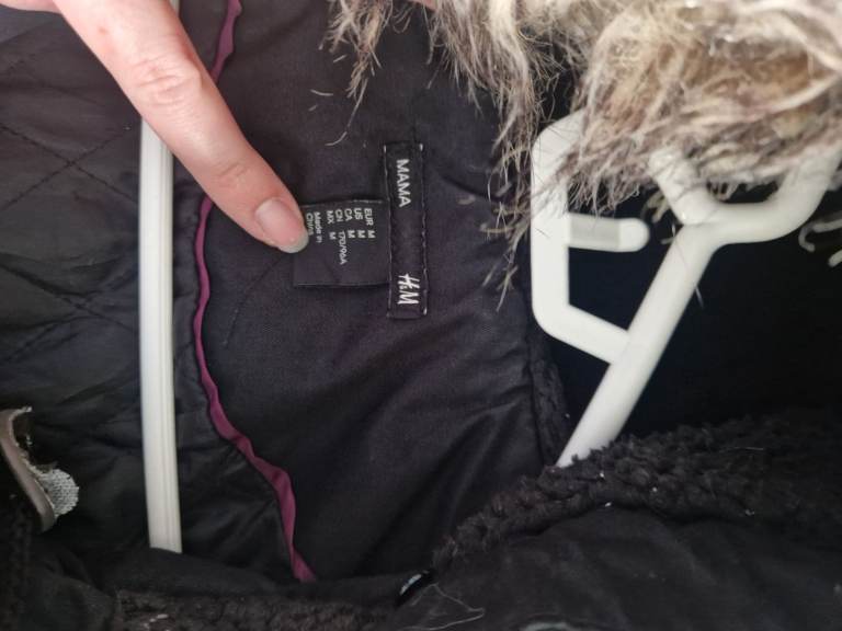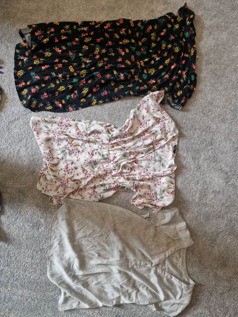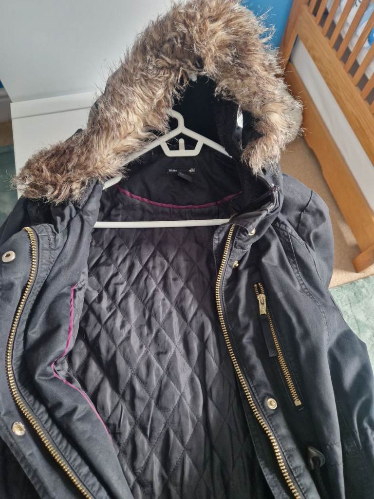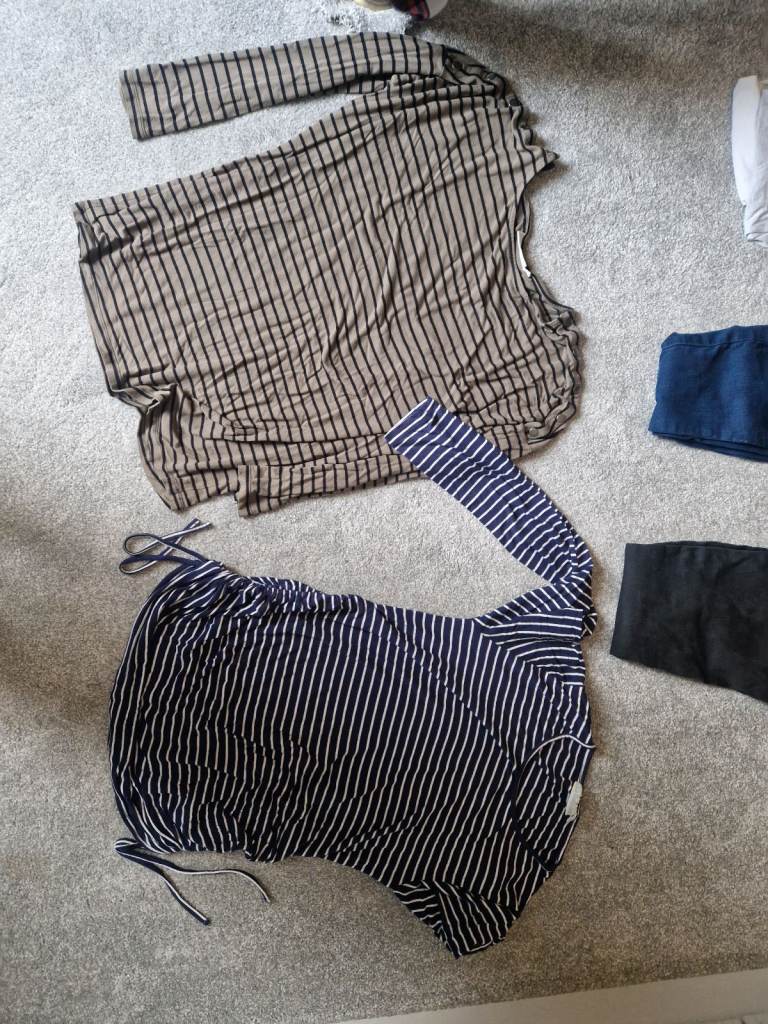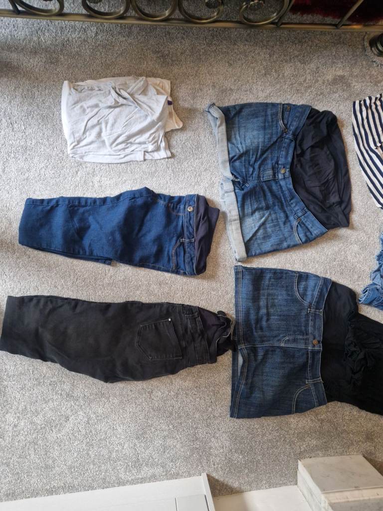 2 x jeans, 1 x denim shorts, 1 x denim skirt, 2 x dresses, some t-shirts, 1 x denim shirt, 2 x leggings, some long sleeved tops/jumper, a bump support. 1 x pair of smart black trousers. 1 x winter coat. Brands include h&m, jojo maman bebe, & others.