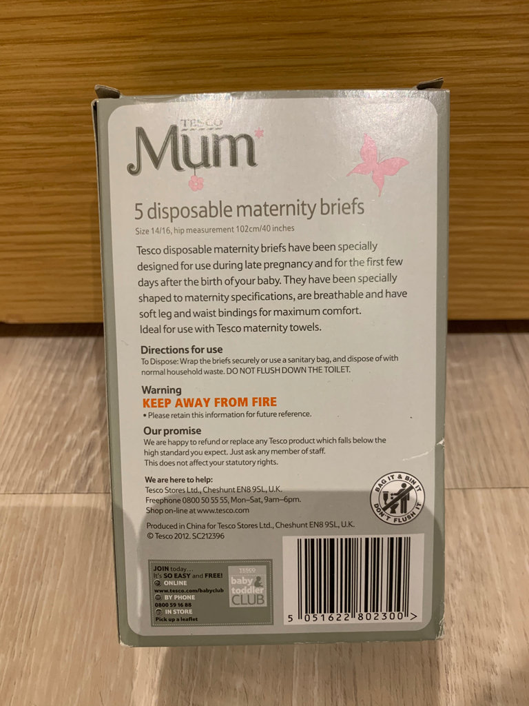 A 5 pack (2 left, which are individually wrapped) of Tesco disposable maternity briefs size 14/16. Hip measurement 102cm/40 inches.