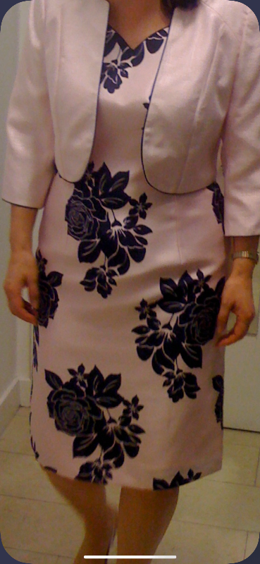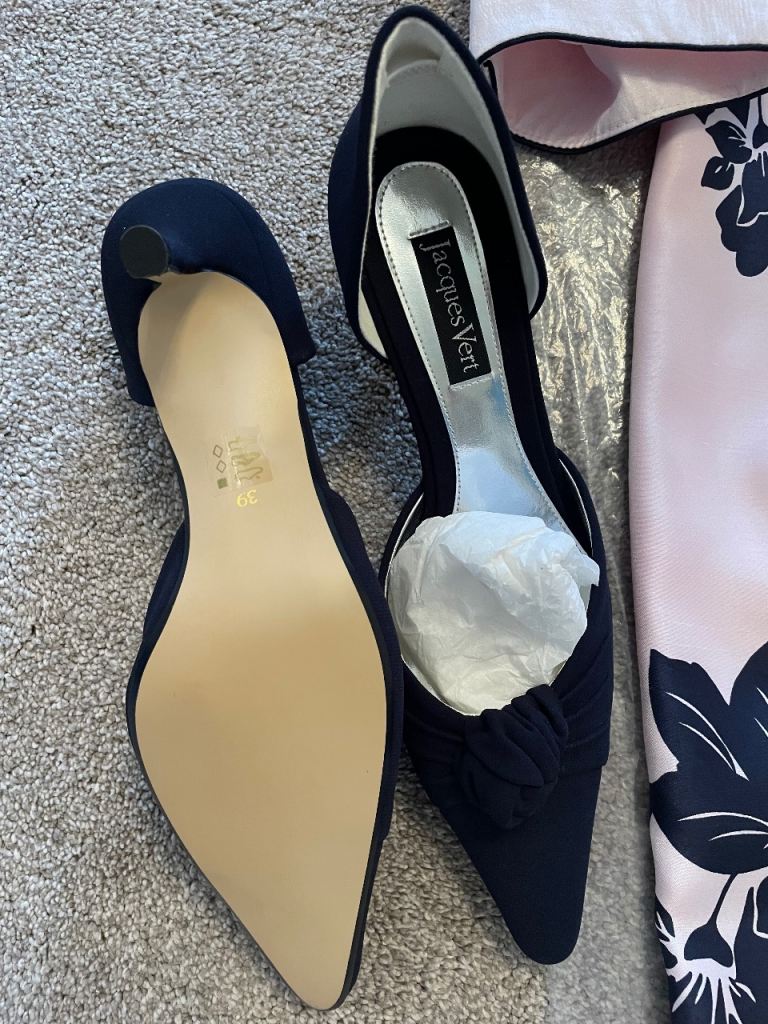 Complete outfit. Immaculate condition. Worn once. Didn't wear the shoes so they are brand new. Dress and jacket size 12, shoes size 6. Fascinator also included.