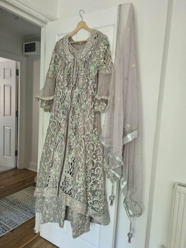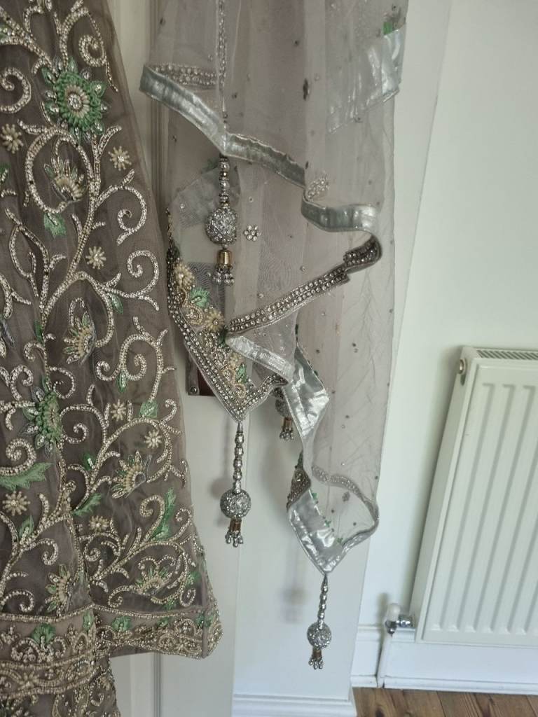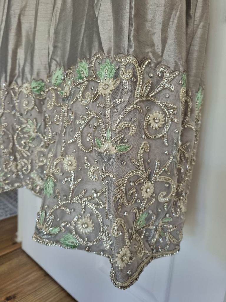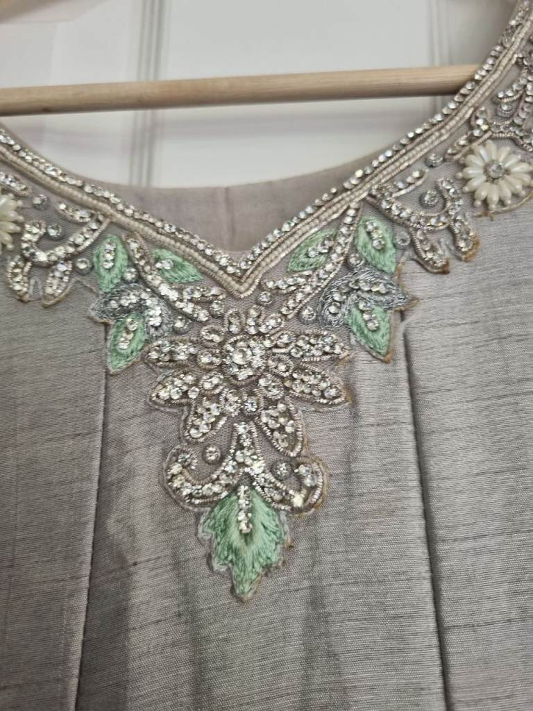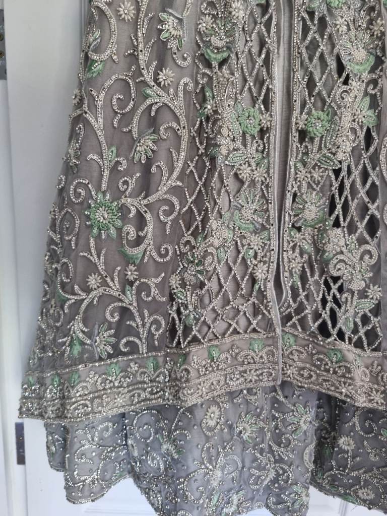 Indian bridal outfit in a soft taupe/grey tone with delicate mint green detailing. The piece is fully adorned with intricate hand-style embroidery, sequins (some have detached), and beadwork throughout – perfect for weddings, receptions, or special occasions.