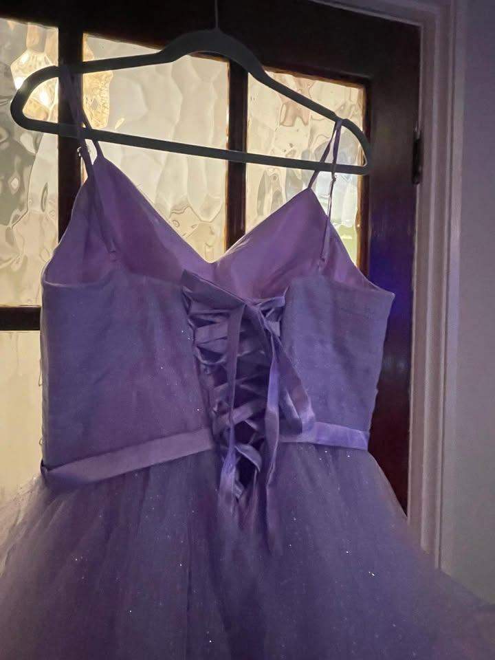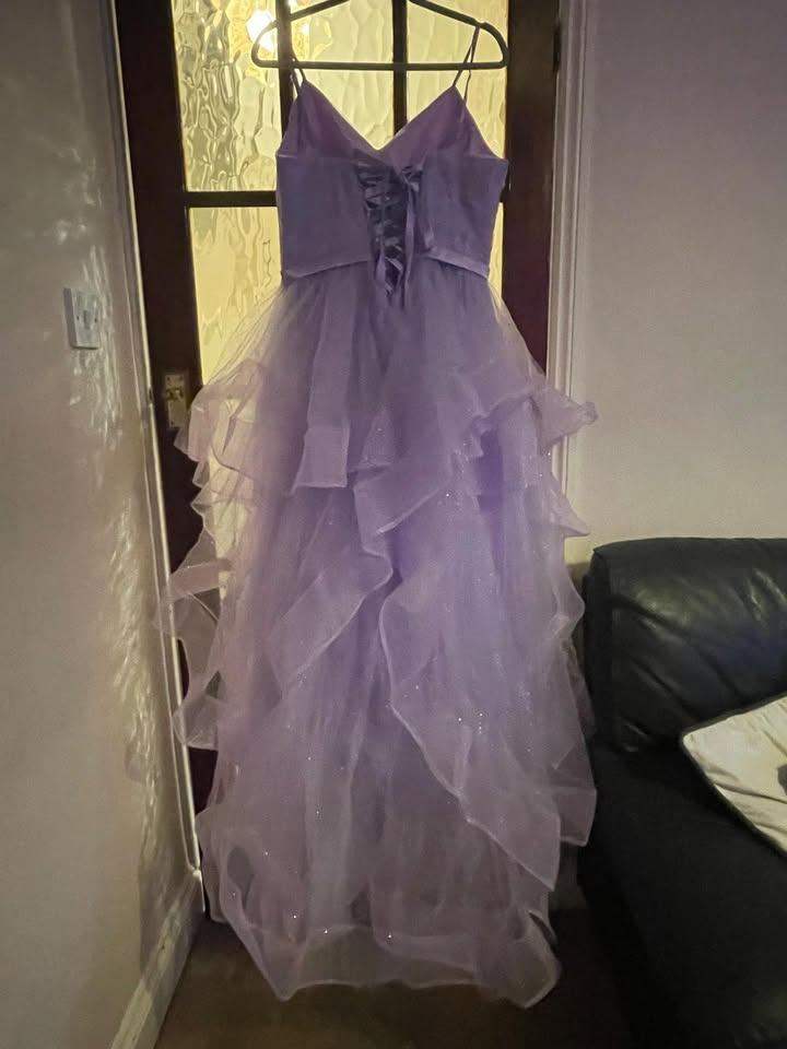 Amazing dress in lilac, ideal for prom or special celebration. It is brand new, we couldn't use it as it arrived too late. Will make anyone feel very special. Was bought for a size 14 but the back is adjustable, so probably can be use for a size 12 or 16. Sorry no postage. Cash on collection only, please.