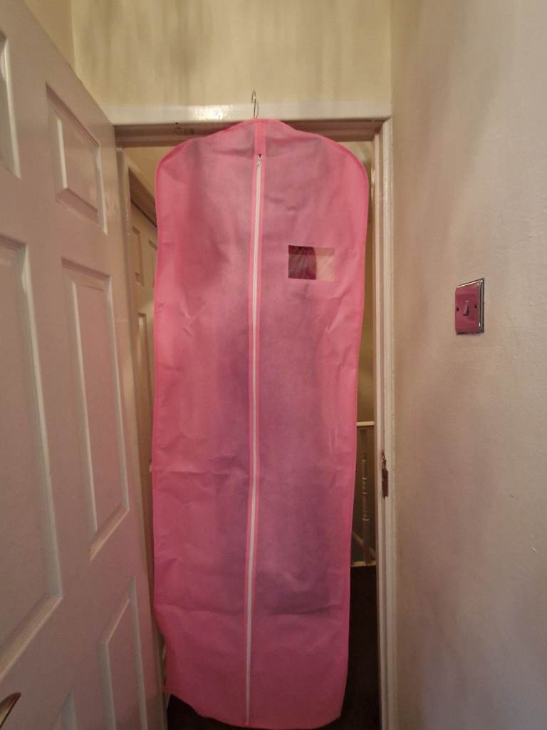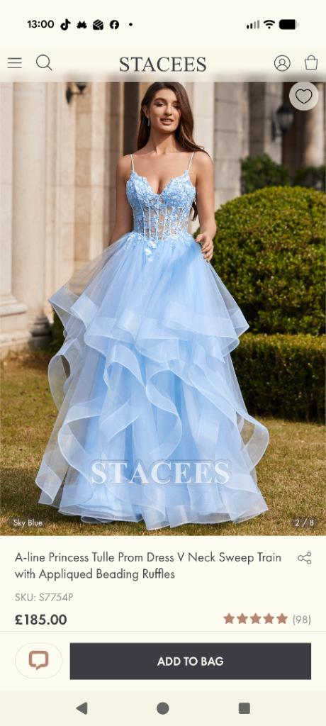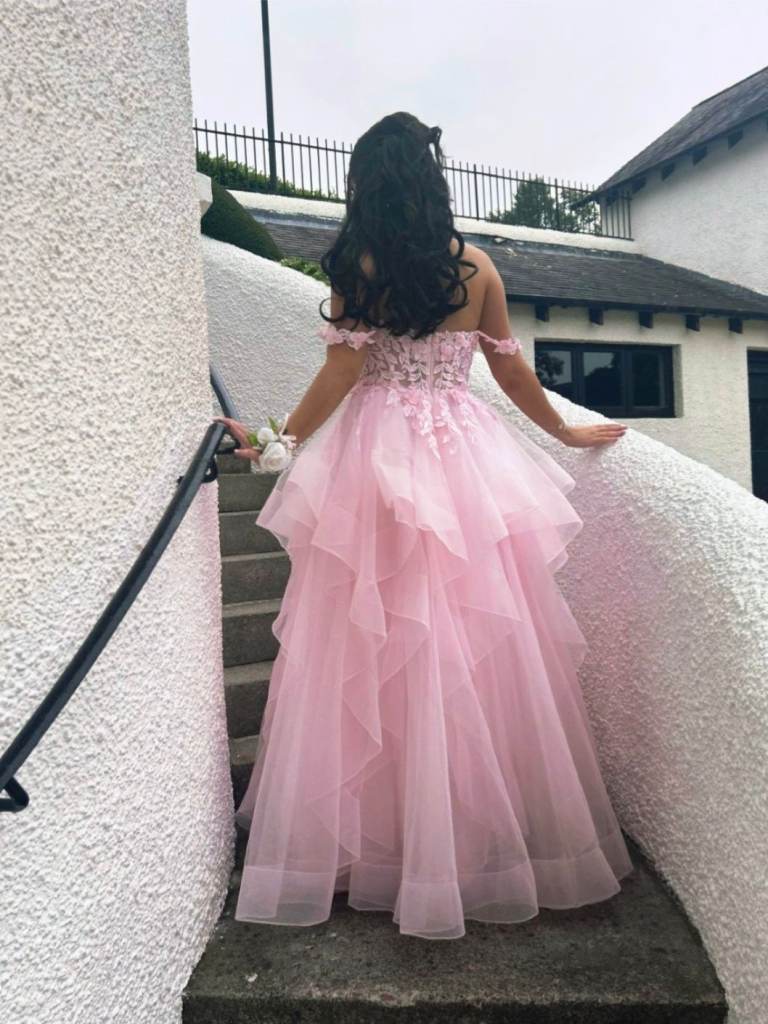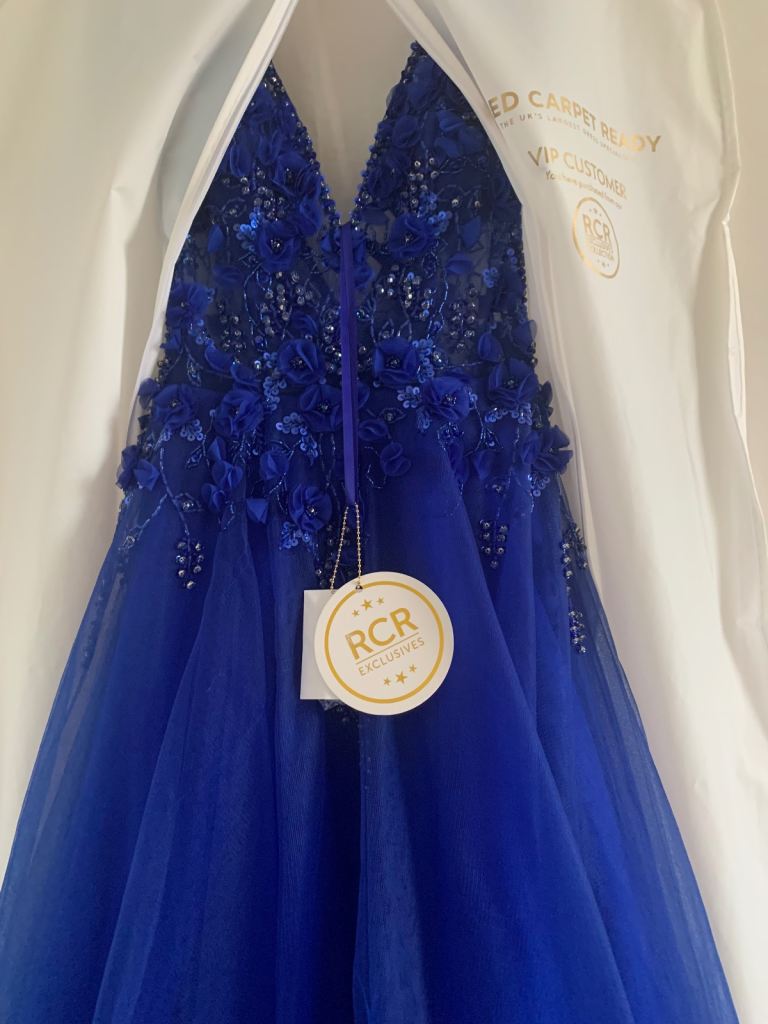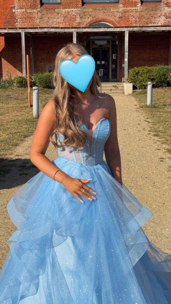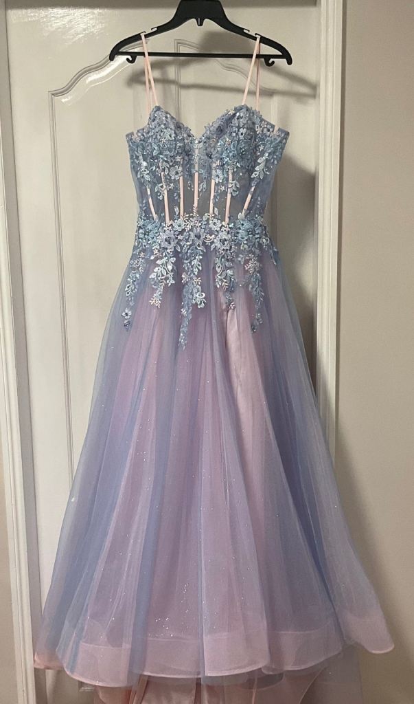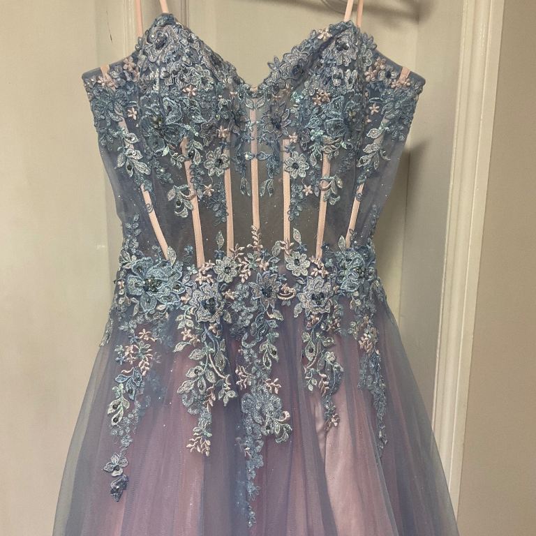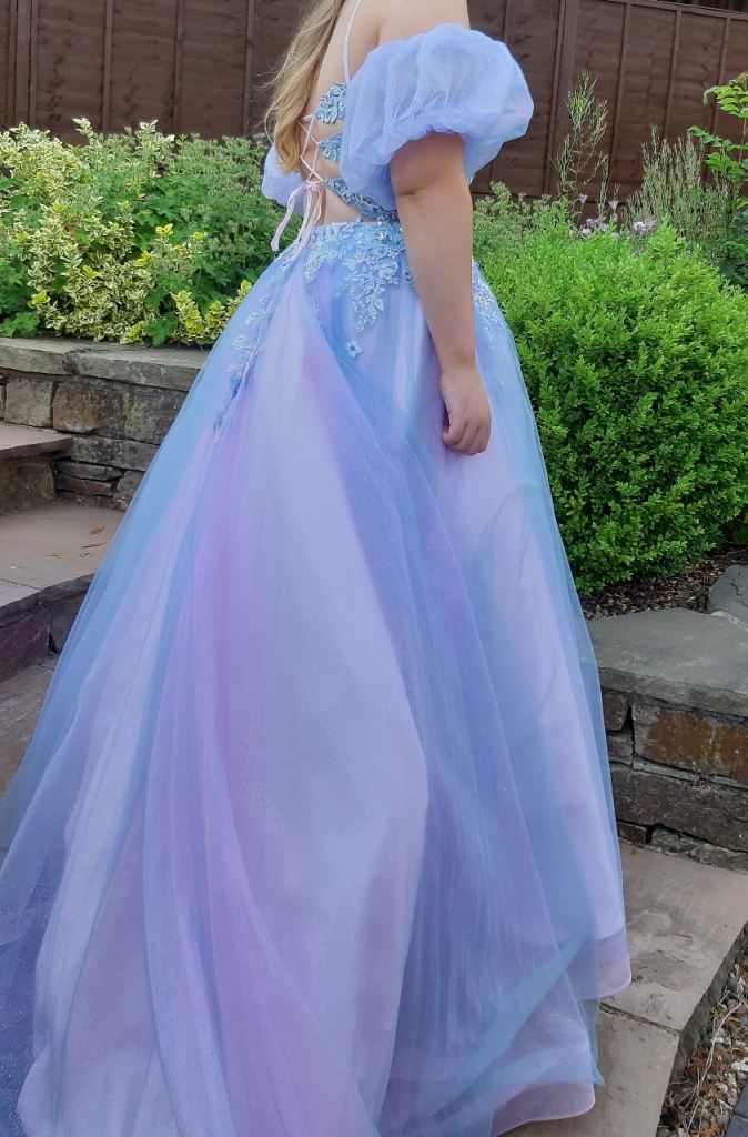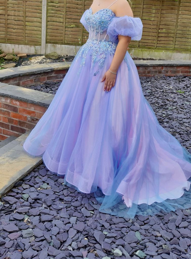 Blue/pink layered prom dress. Medium. Detachable puff sleeves. Blue shawl. Detailed bodice. Worn once.