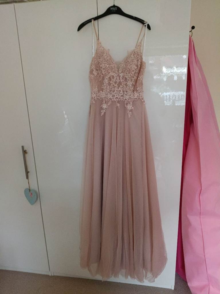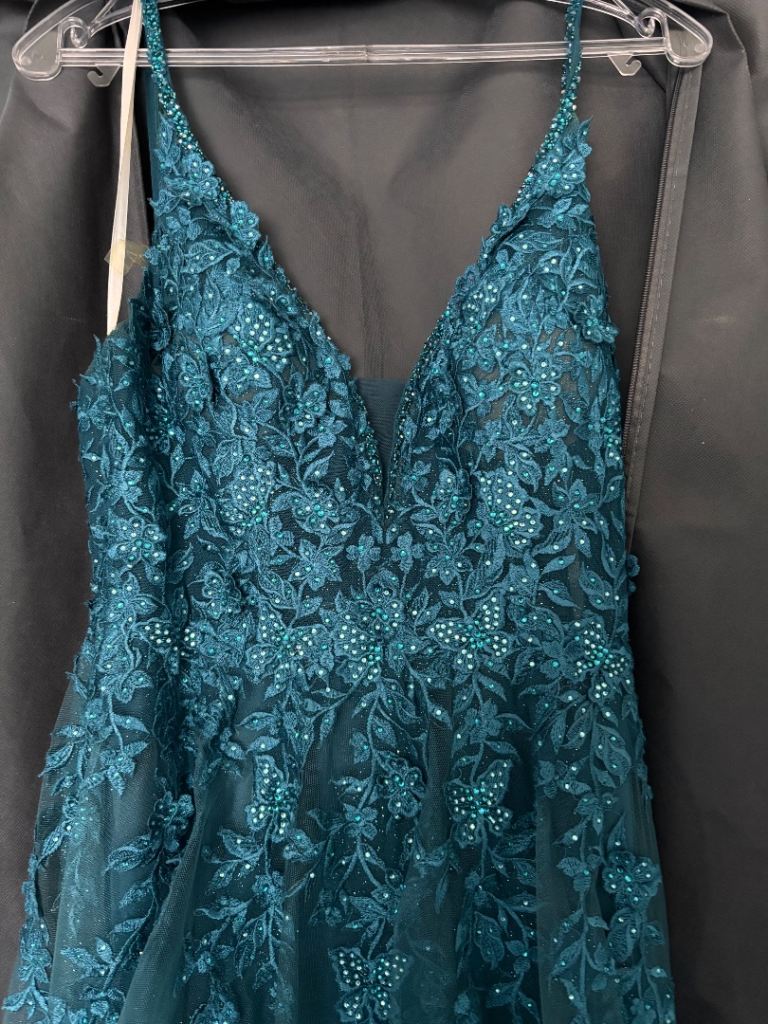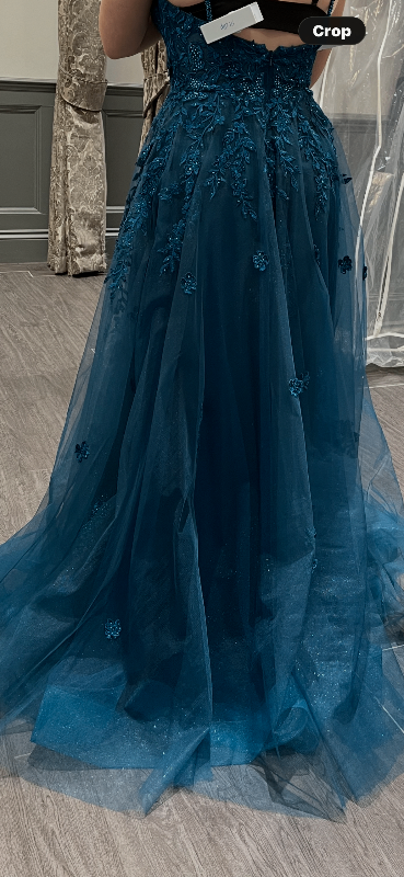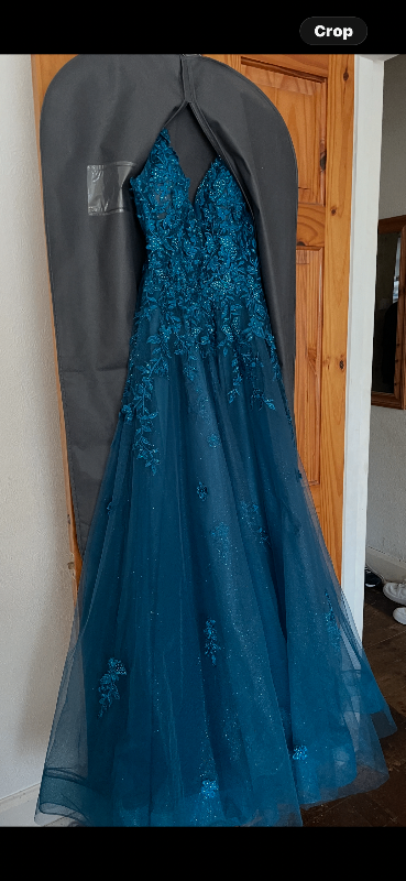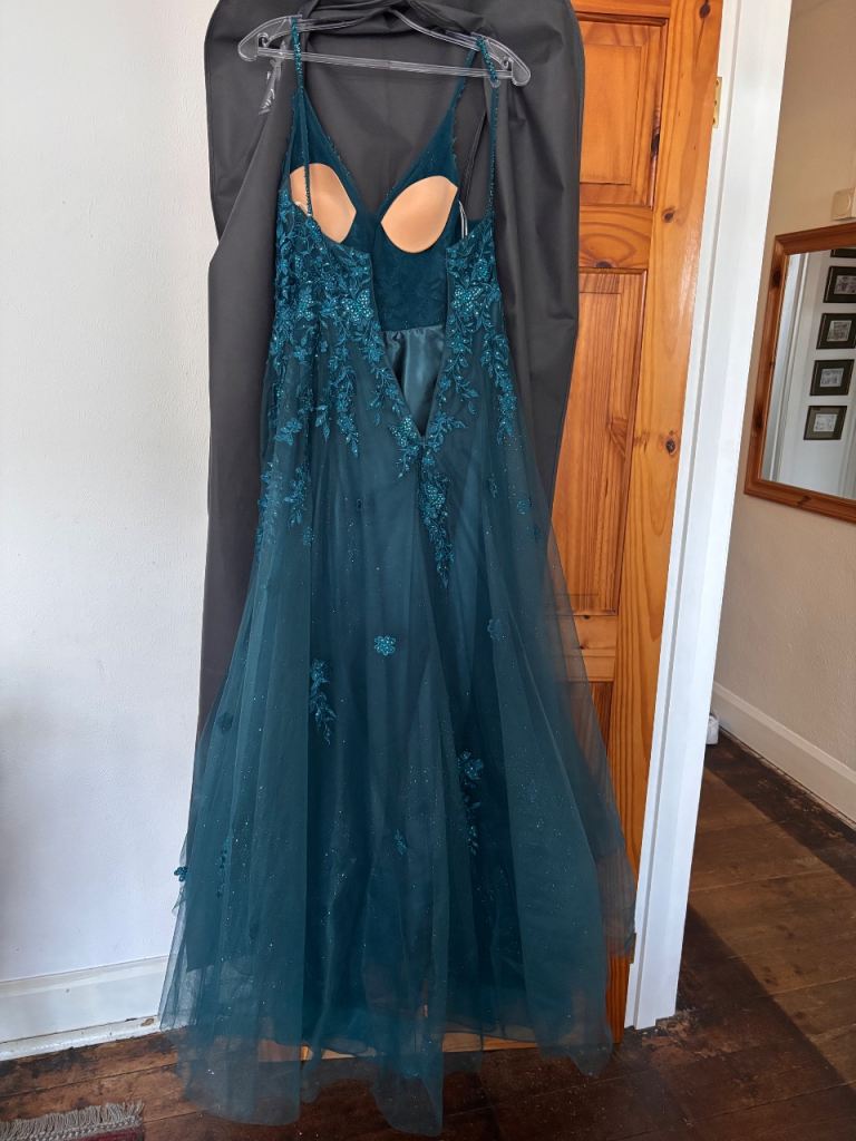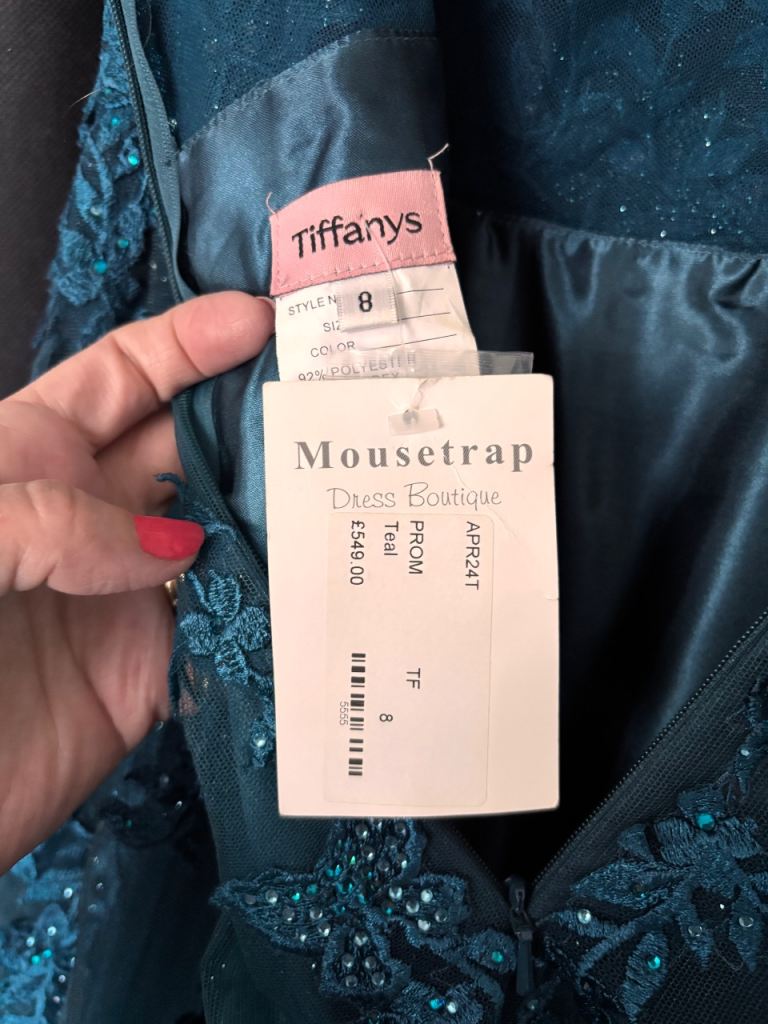 Beautiful teal coloured three layered Mousetrap Tiffany’s prom dress/ball gown. Satin base with two netting layers. Top layer with intricate delicate beading.