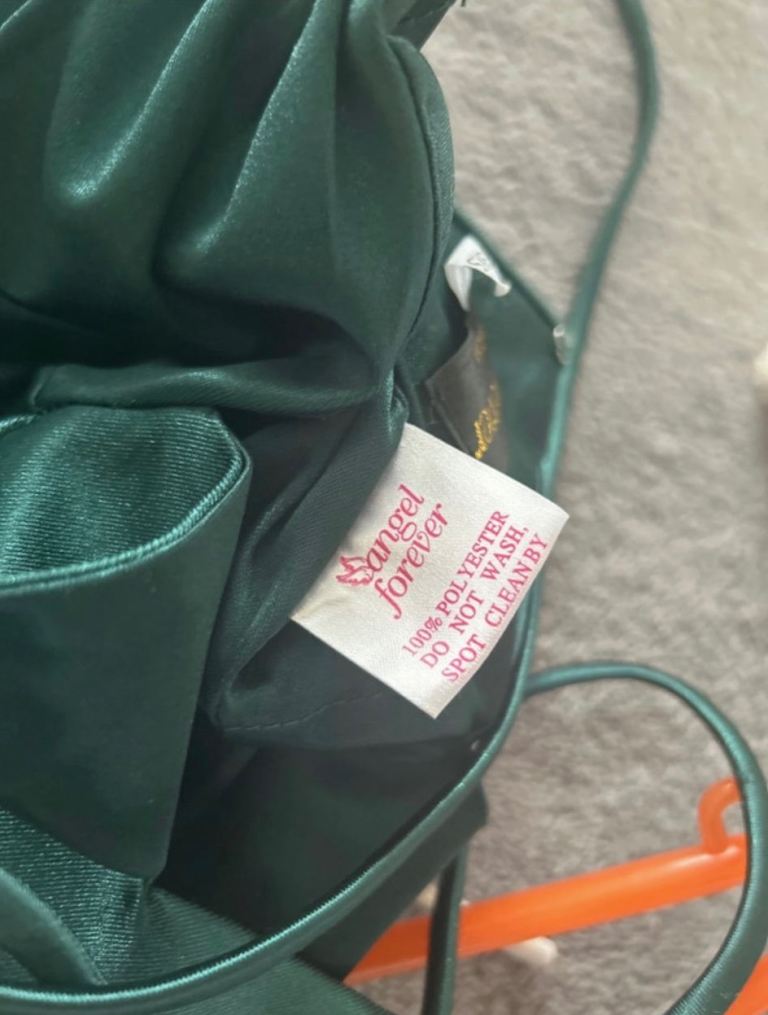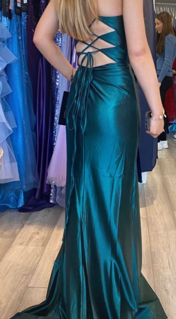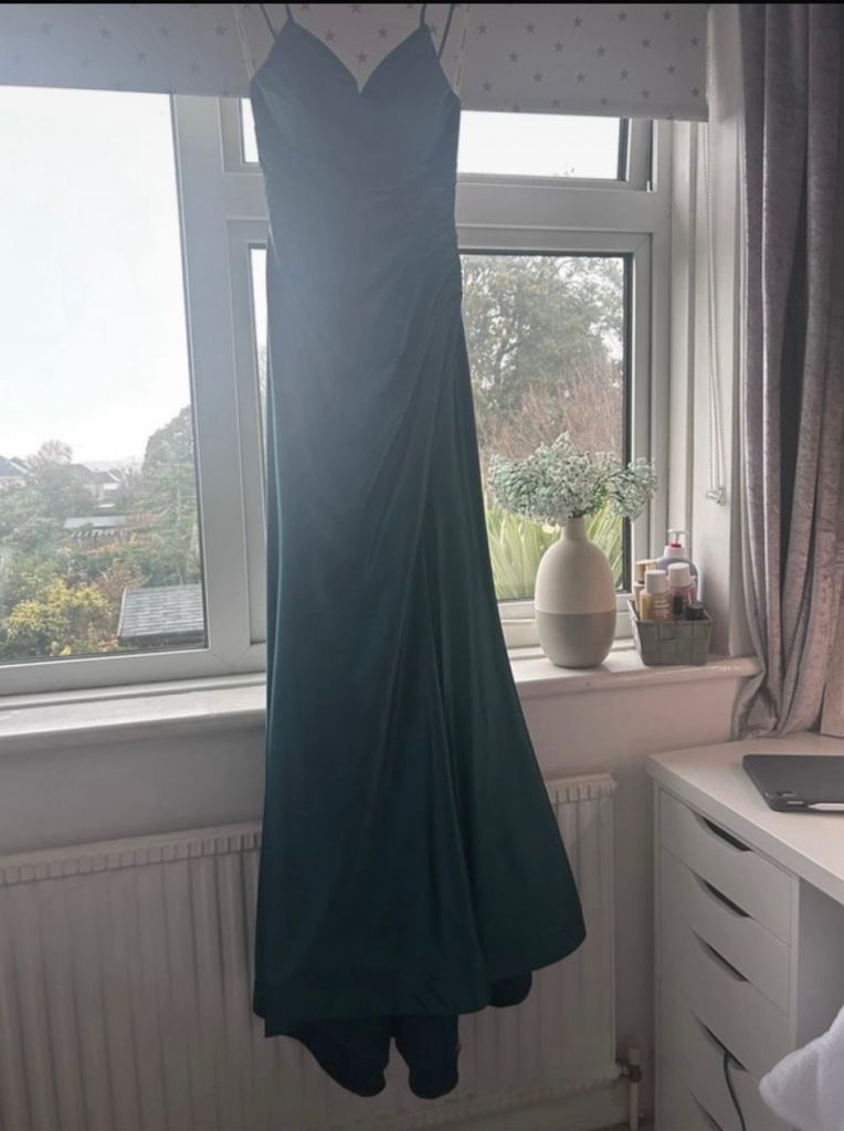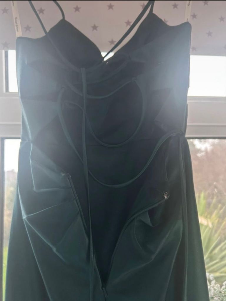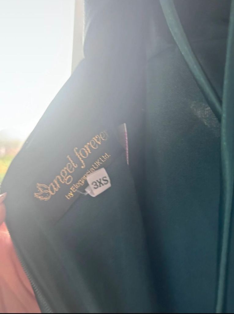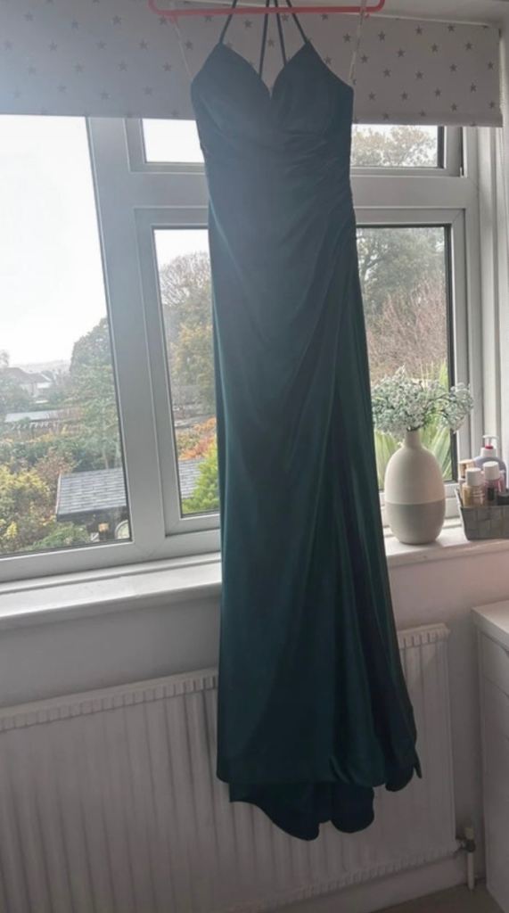 Angel forever, size 3xs. deep sea green with shimmer. Strap shoulder dress with tie back. Worn once . Excellent condition. Uk size 4/6 . Smoke free household. Comes with protective cover and shoulder cover.